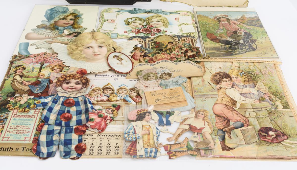 Approx. 13 different cardboard pictures, including pop-up "To my Valentine", 3 calendars, 2 puzzle pictures etc. Partly small defects and creases.
