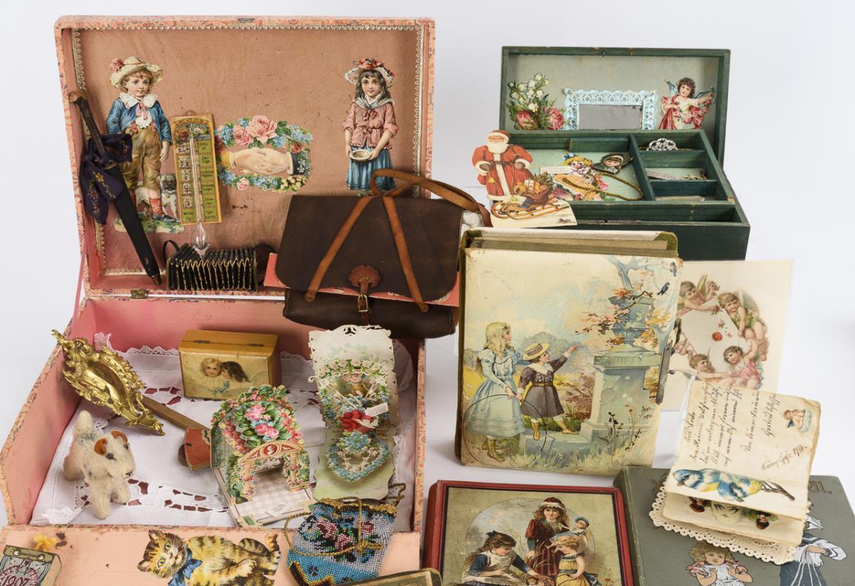 2 old boxes with extensive accessories. Including satchel, 3 books ("Plauderstündchen", "The Doll Family" and "Two New Tales"), 1 photo album, Steiff doggie, tear-off calendar from 1907, wafers etc. Signs of age and use.