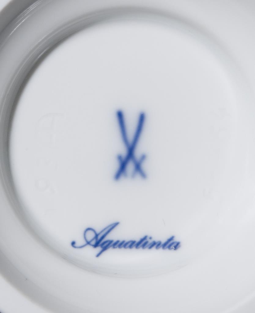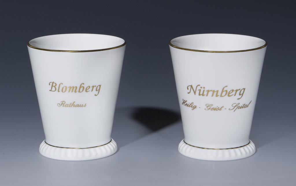 Zwei Becher mit Camaieu-Malerei: Ansichten Blomberg - Rathaus, Nürnberg - Heilig-Geist-Spital. Rückseitig mit blauen Titeln. Vier Becher mit blauen Markenzeichen. Drei Becher rückseitig in Gold bezeichnet: Freunde des Meissener Porzellans. Goldstaffage. Standfüße reliefiert.