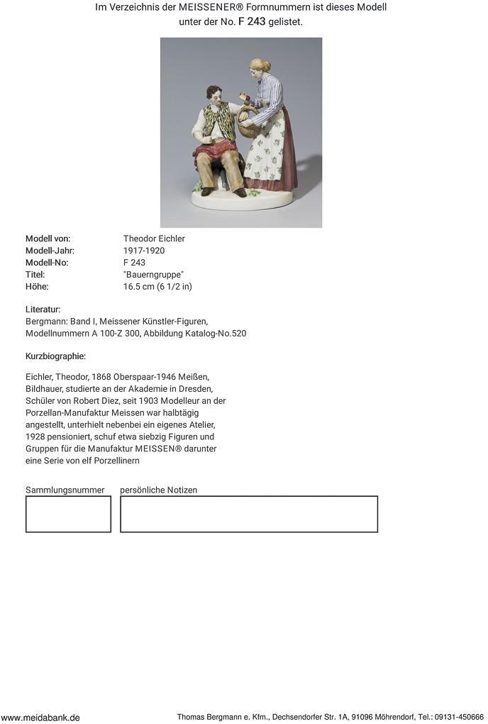 Eichler, sculptor, studied at the Academy in Dresden. Pupil of Robert Diez. Since 1903 modeller in Meissen, was employed part-time, maintained his own studio on the side, retired in 1928 * Partner auction Bergmann.