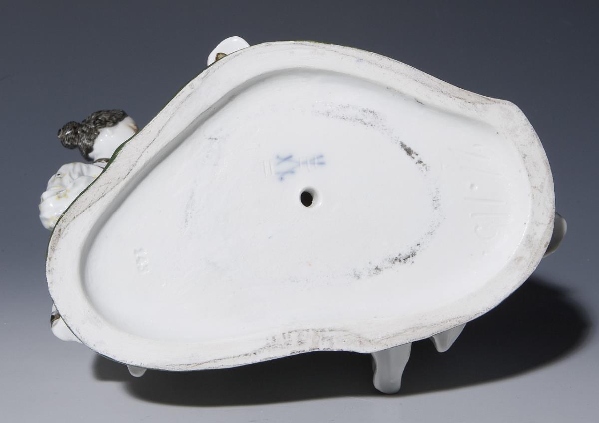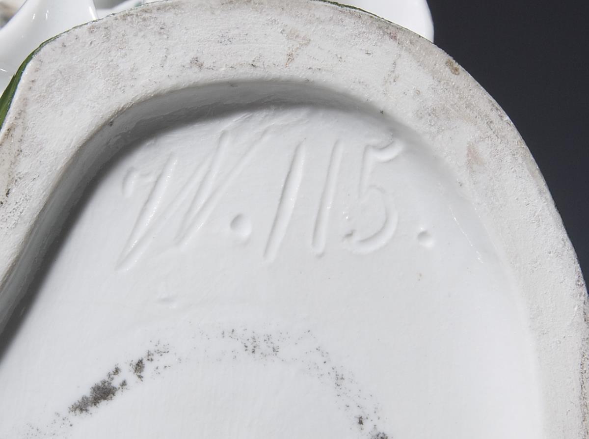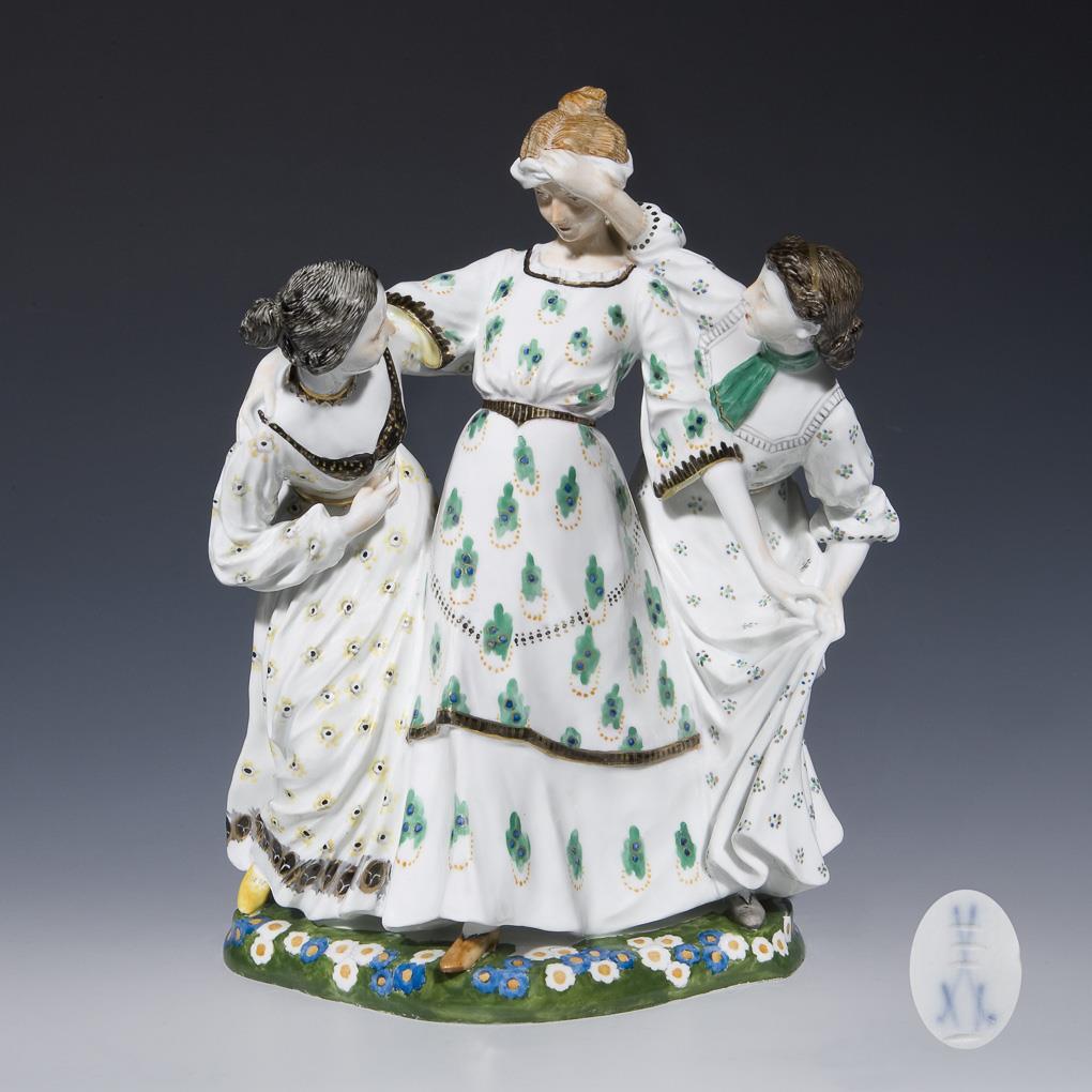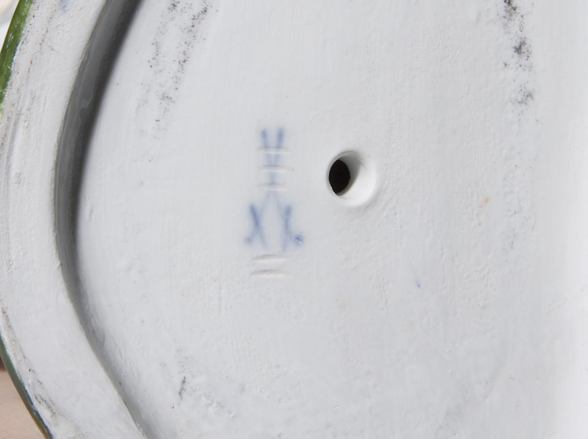 Model by Theodor Eichler 1905. colored painted, gold painted. Incised mark, pressed mark, sword mark painted three times, painted twice underneath. Replaced base rim, base bottom partially restored.