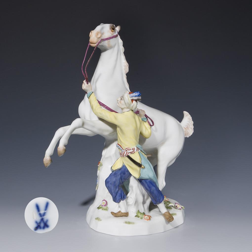 Model by Johann Joachim Kaendler 1765. counterpart to model no. A 51 x "Moor with horse". Colorfully painted. Incised mark, press mark, sword mark at base painted three times. One rein band glued, one flower minimally bumped.