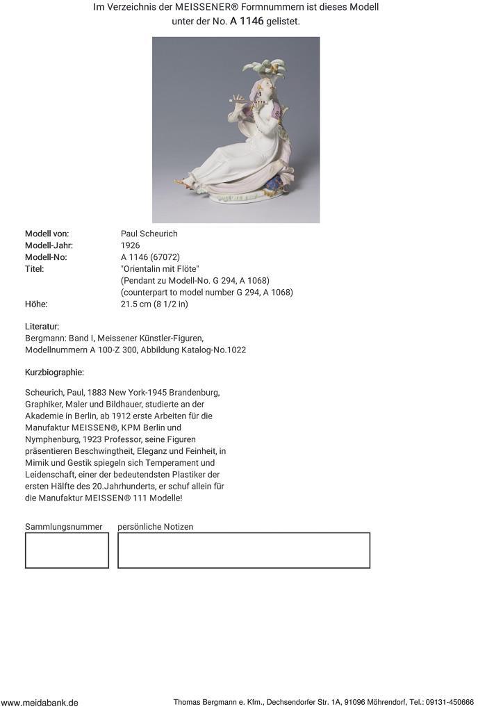 Scheurich, painter, graphic artist and sculptor. Studied at the Academy in Berlin. From 1912, first works for Meissen, KPM Berlin and Nymphenburg, 1923 professor. Meissen manufactory price: 7990, - Euro * Partner auction Bergmann | Counterpart to cat. No. 3206.