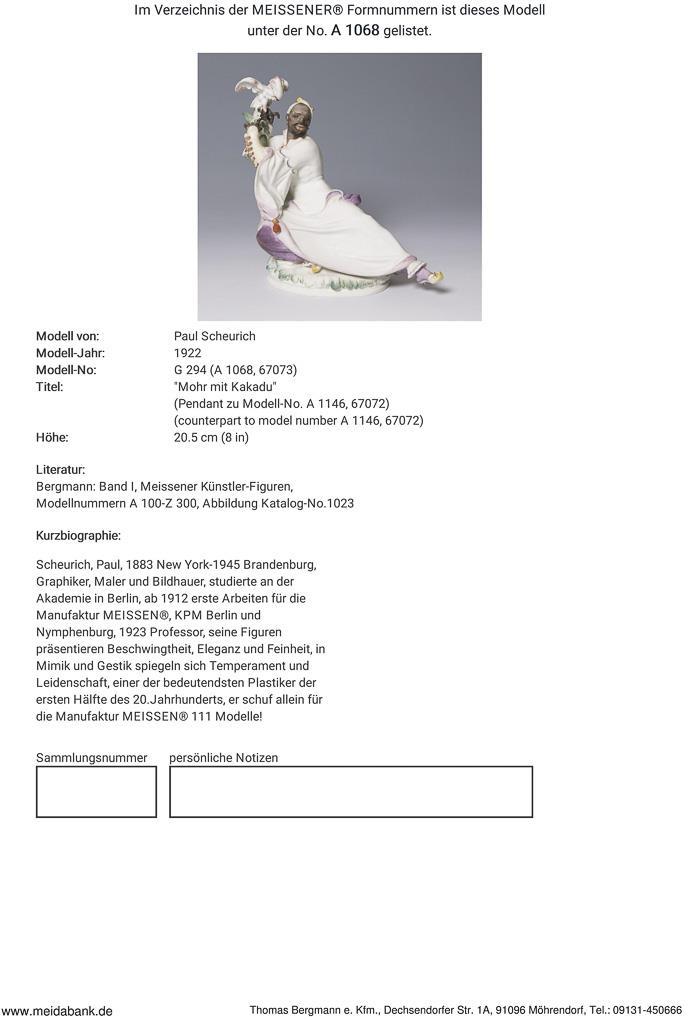 Scheurich, painter, graphic artist and sculptor. Studied at the Academy in Berlin. From 1912 first works for Meissen, KPM Berlin and Nymphenburg, 1923 professor. Meissen manufactory price: 7990, - Euro * Partner auction Bergmann | Counterpart to cat. No. 3208.