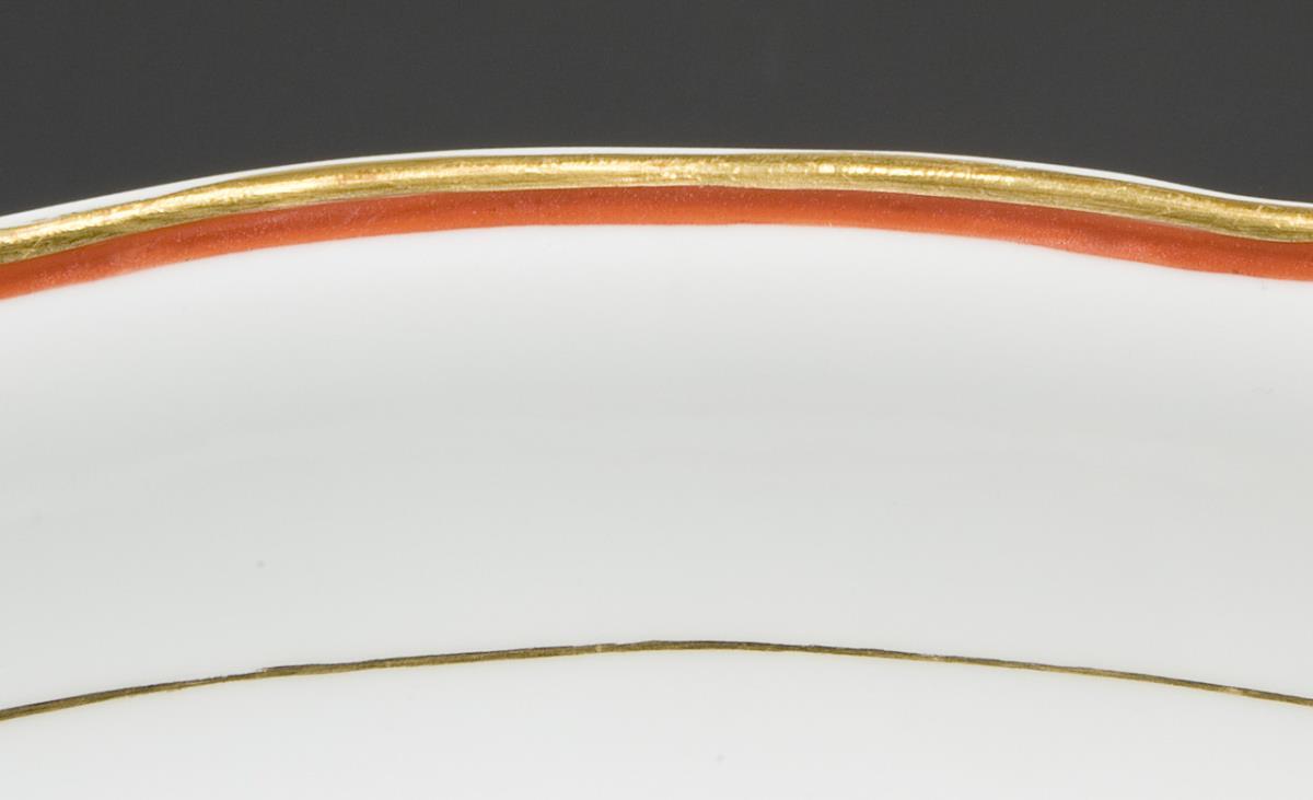 Form "New Cutout" with timeless rim decor. 58 pieces: 12 dinner plates, 12 soup plates, 12 large dessert plates, 12 small dessert plates, 1 round bowl, 2 oval bowls, 2 dinner plates, 2 square bowls, 2 sauce boats, 1 tureen. Coral red and gold painted. Press marks, sword marks with dot, two dessert plates 1976 painted twice.