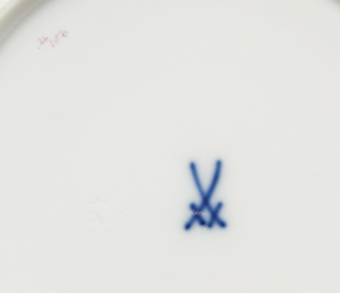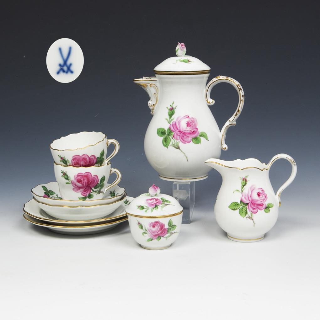 Form "New Cutout", colorfully painted, gold painted, decor "Red Rose". 9 pieces: 2 cups, 2 saucers, 2 dessert plates, mocha pot, milk jug, sugar bowl. Press marks, painter marks, sword marks painted twice.