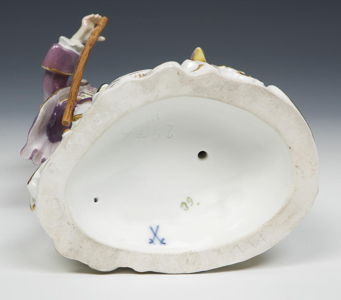 Model by Carl Christoph Punct 1763. Colorfully painted, gold painted. Incised mark, press mark, painter's mark, sword mark. Staff, one arm, left side cavalier from shoulder to knee, back base edge restored.
