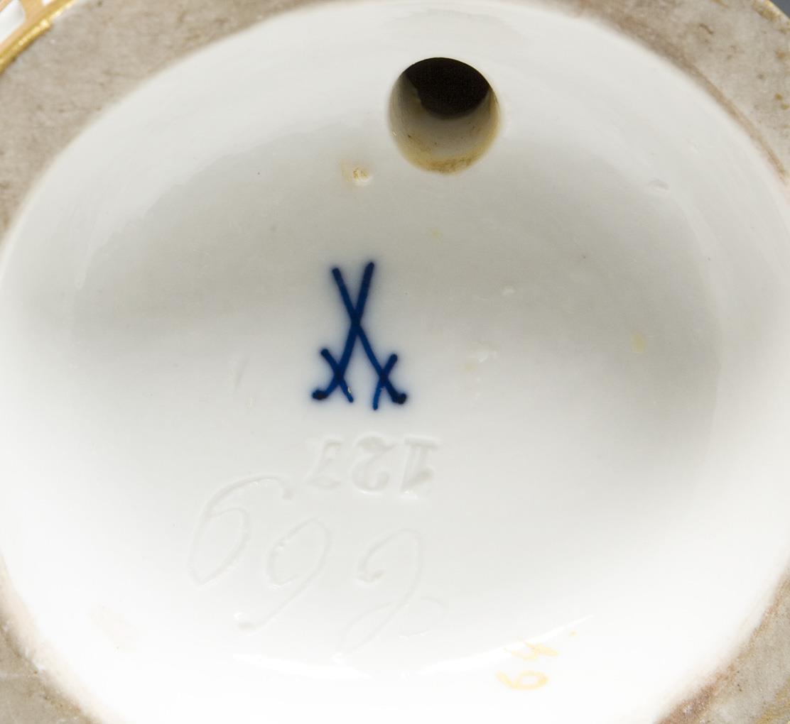 Model by Michel Victor Acier 1770. counterpart to model no. C 68. colorfully painted, gold painted. Incised mark, press mark, painter's mark, sword mark. Handle, one skirt corner restored, leaf bumped.