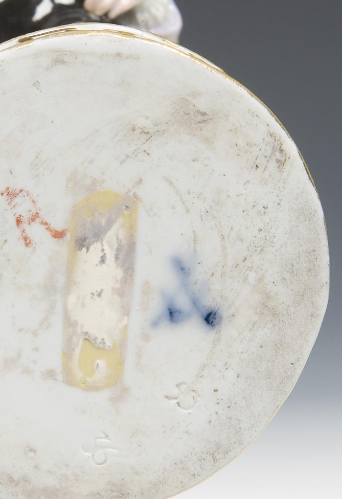 Model by Michel Victor Acier 1768-1770. Pendant to model no. C 72. Colored painted, gold painted. Figure as a table centerpiece crowning. Unglazed base, press marks, sword mark. Hands, hat, hair bow restored.