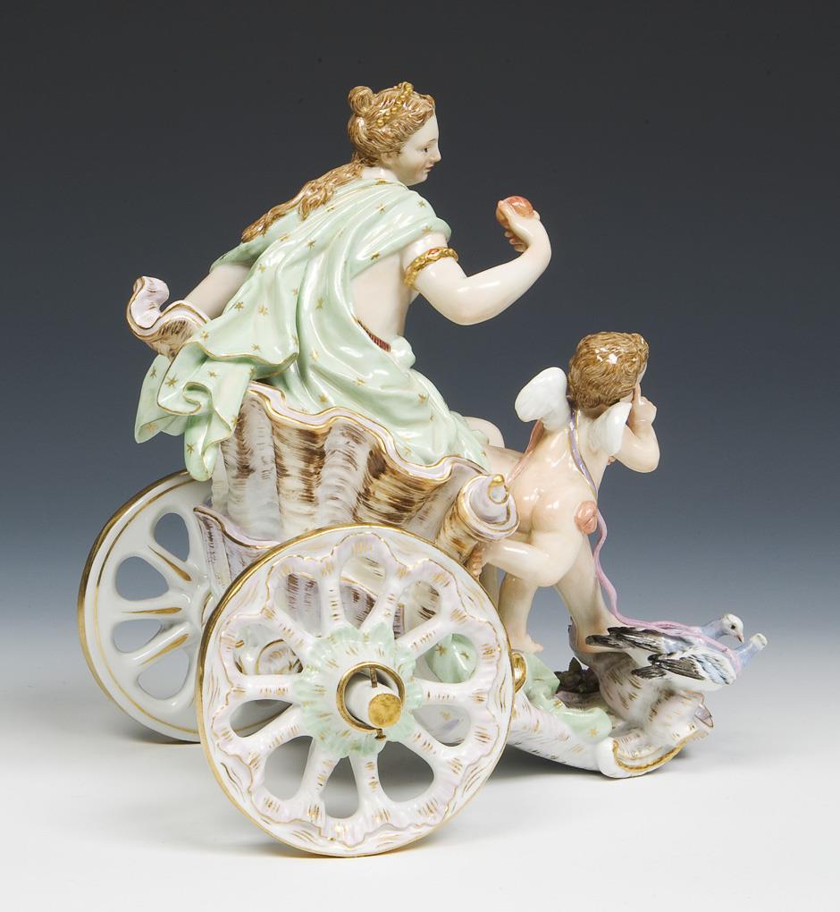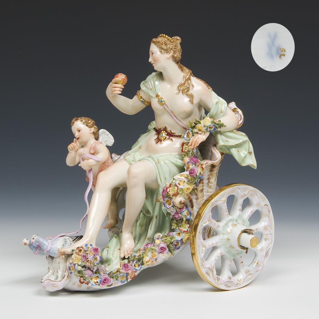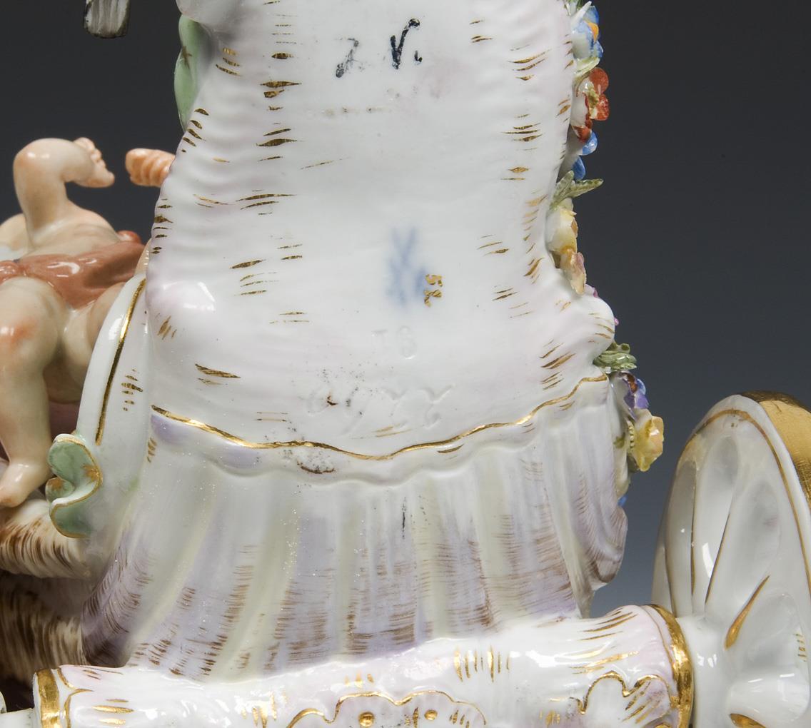 Model by Johann Joachim Kaendler 1755. Colorfully painted, gold painted. Incised mark, press mark, painter's mark, sword mark. One bolt glued.