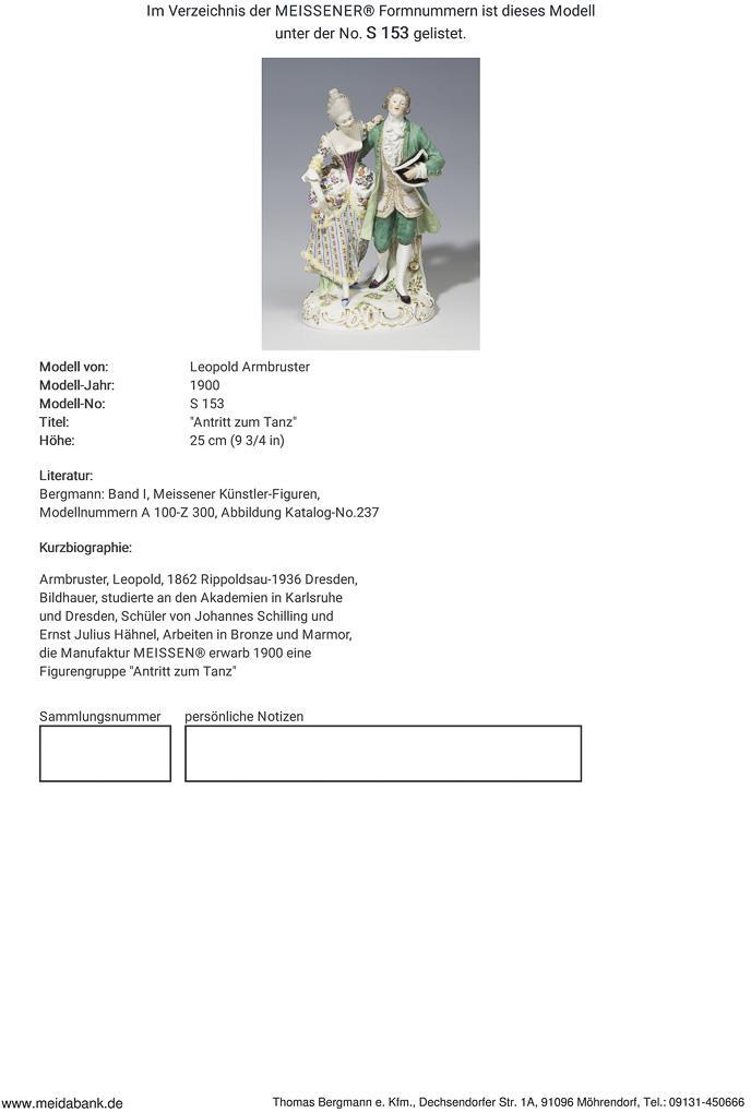 Armbruster, sculptor, studied at the academies in Karlsruhe and Dresden. Student of Johannes Schilling and Ernst Julius Hähnel. The manufactory acquired a group of figures * partner auction Bergmann in 1900.