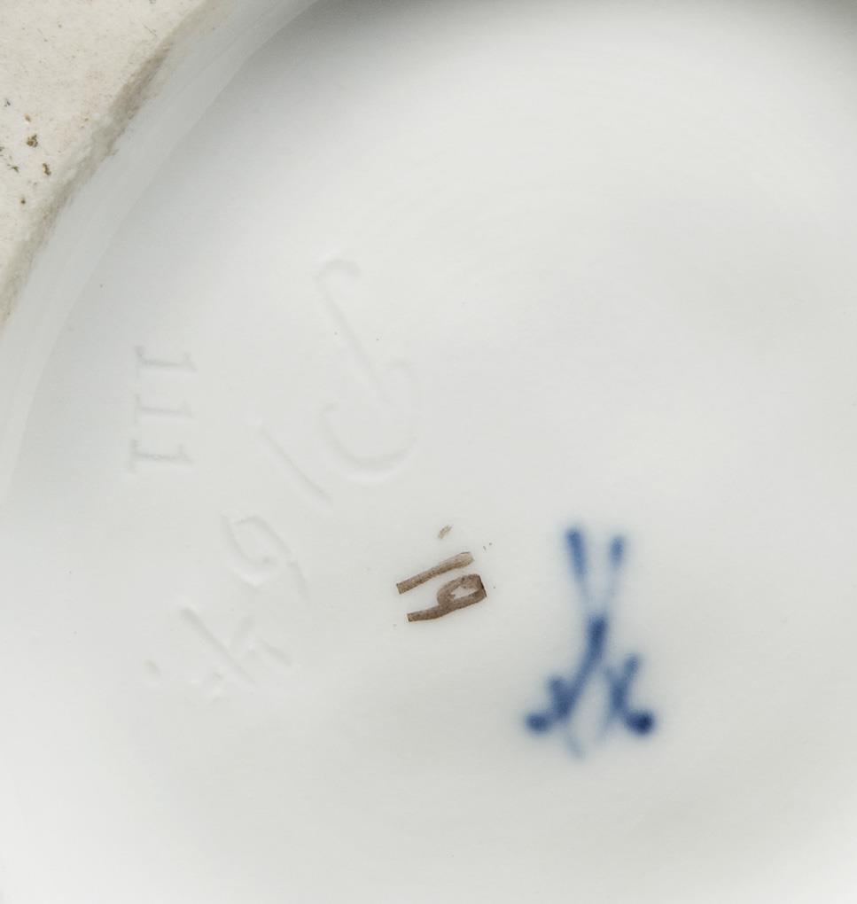 Model by Gustave Deloy 1895-1896. Colorfully painted, gold painted. Incised mark, press mark, painter's mark, sword mark. Rear floral bouquet partially, frontal leaf tips minimally bumped.
