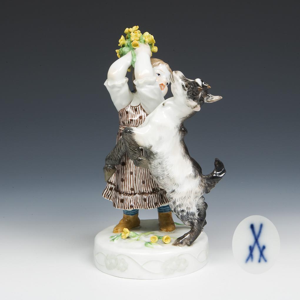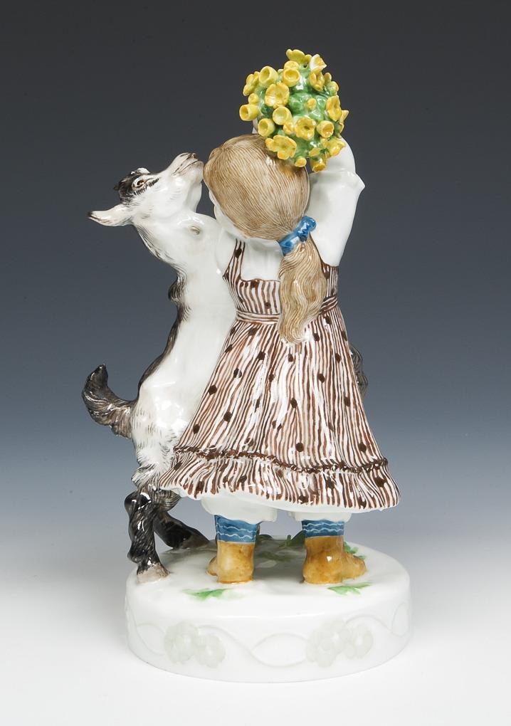 Model by Erich Hösel 1905. colored painted. Incised mark, press mark, painter's mark, sword mark. Flowers, a hand, dress and goat half restored.
