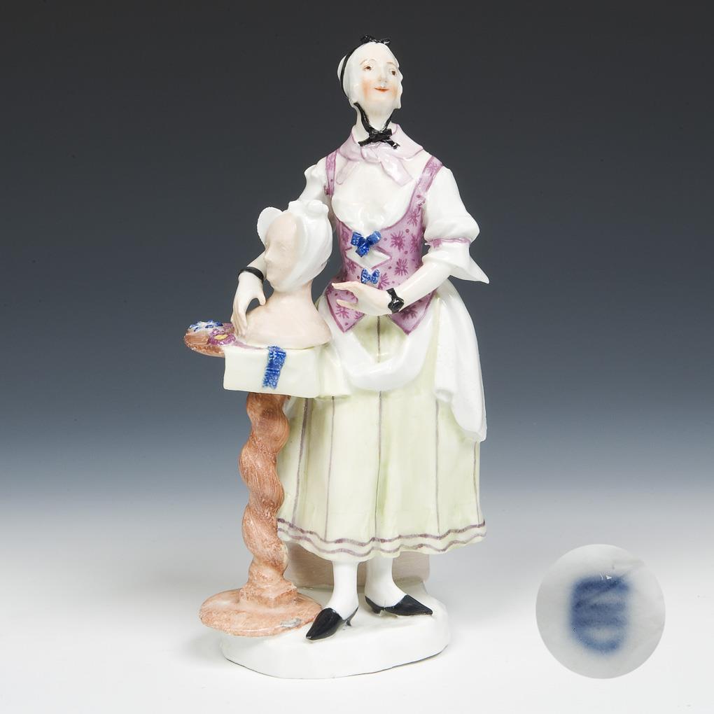Model attributed to Johann Joseph Niedermeyer. Pendant to "Wigmaker". Painted in color. Bossierer letter P, painter's number 13, binding plate. Tablecloth, a foot, a blouse tip, a hat tip, bows restored, base minimally bumped, small burn crack on the edge of the base.