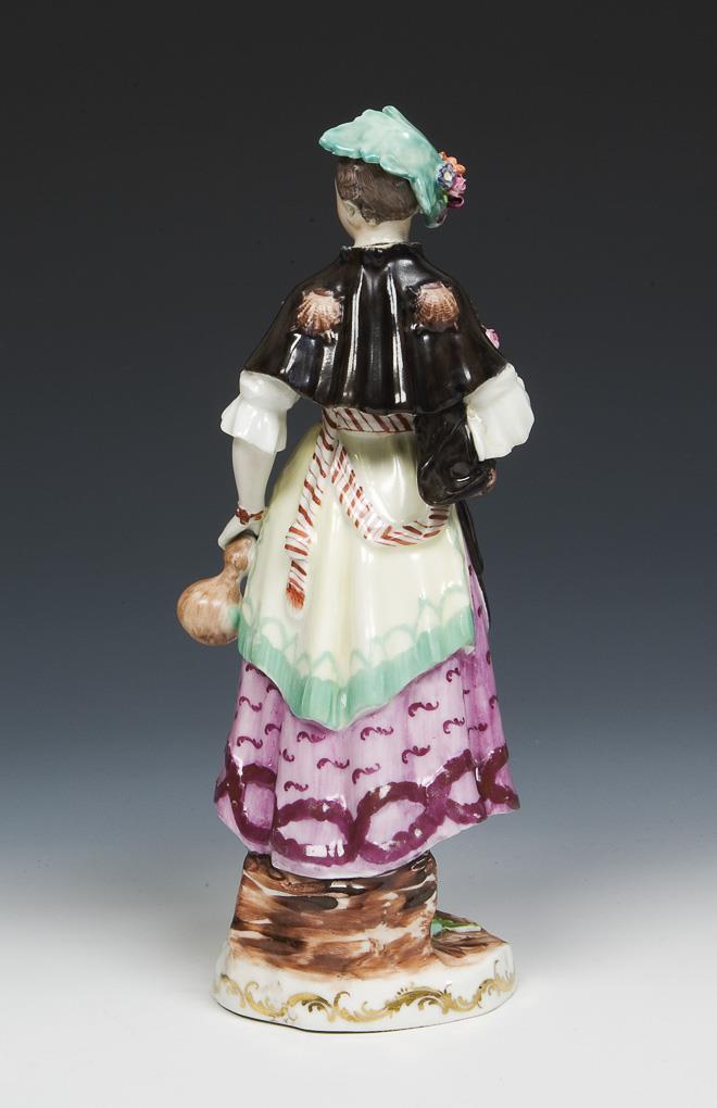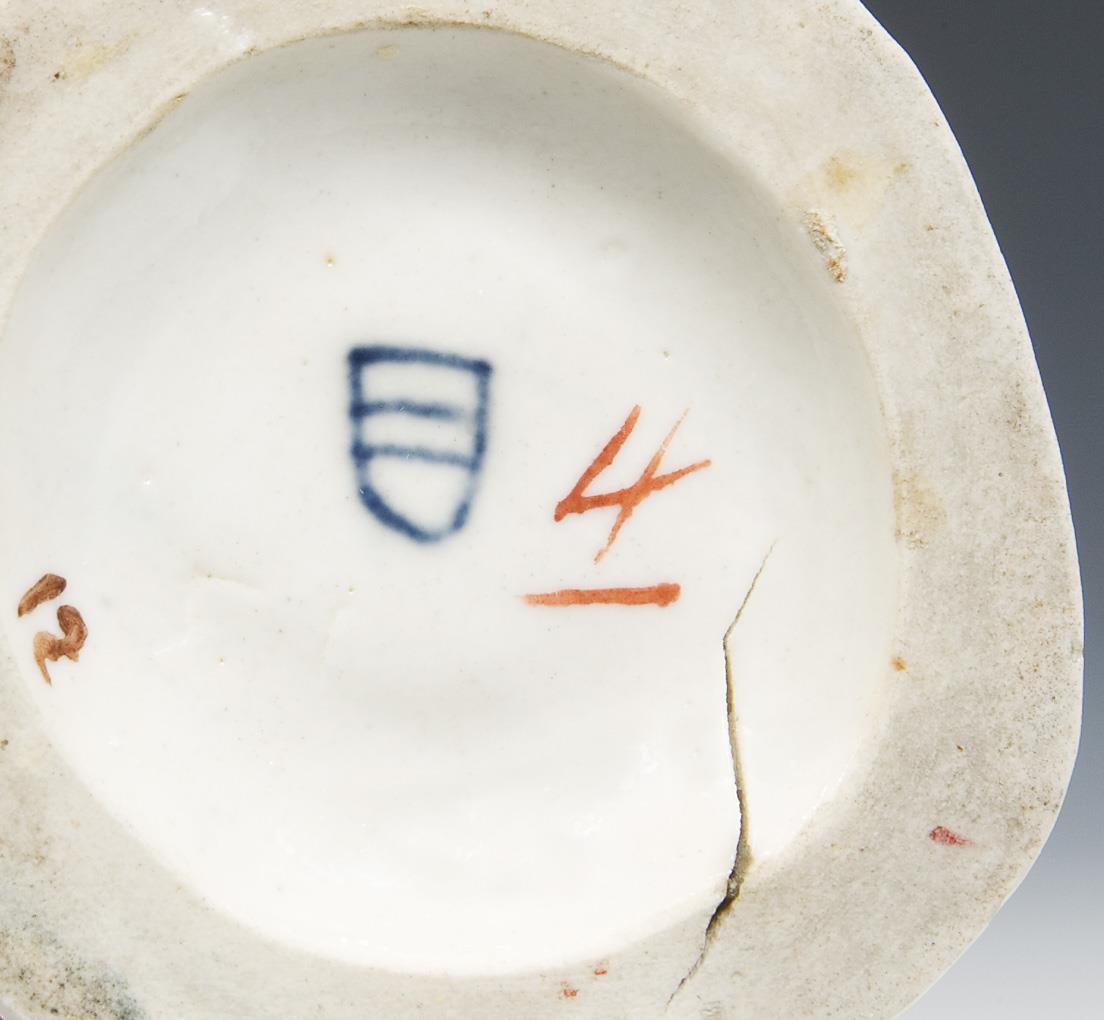 The scallop shell is the symbol of St. James, patron saint of pilgrims. His tomb in Santiago de Compostela is an important destination for pilgrims traveling there on the Way of St. James. Painted in color, gold painted. Incised mark, painter's marks, binding sign. Bust, arm with flowers restored, flowers minimally bumped, in the base burn crack.