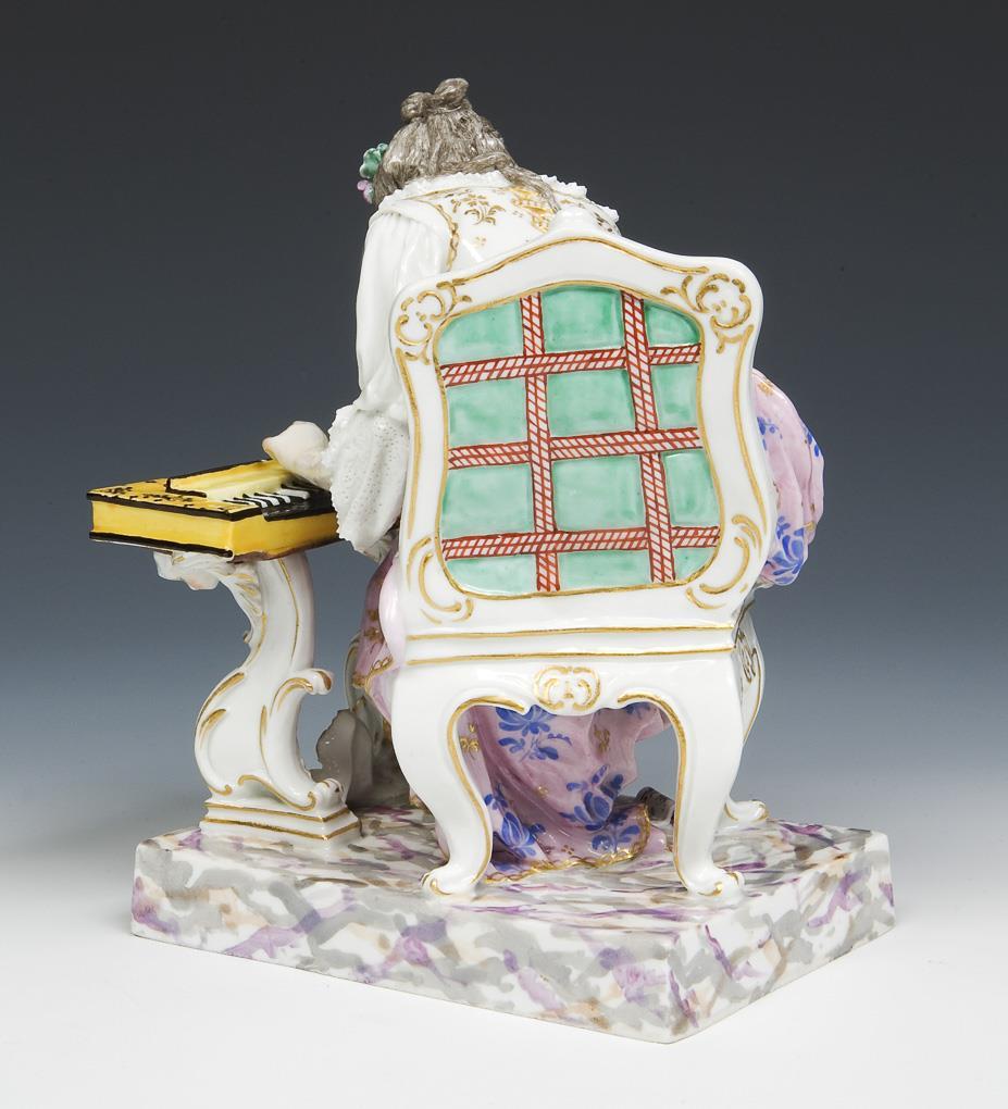Model by Johann Christian Wilhelm Beyer 1763. Colorfully painted, gold painted. Incised mark, pressed mark, crowned double C mark. Flower, sheet of music minimally bumped.