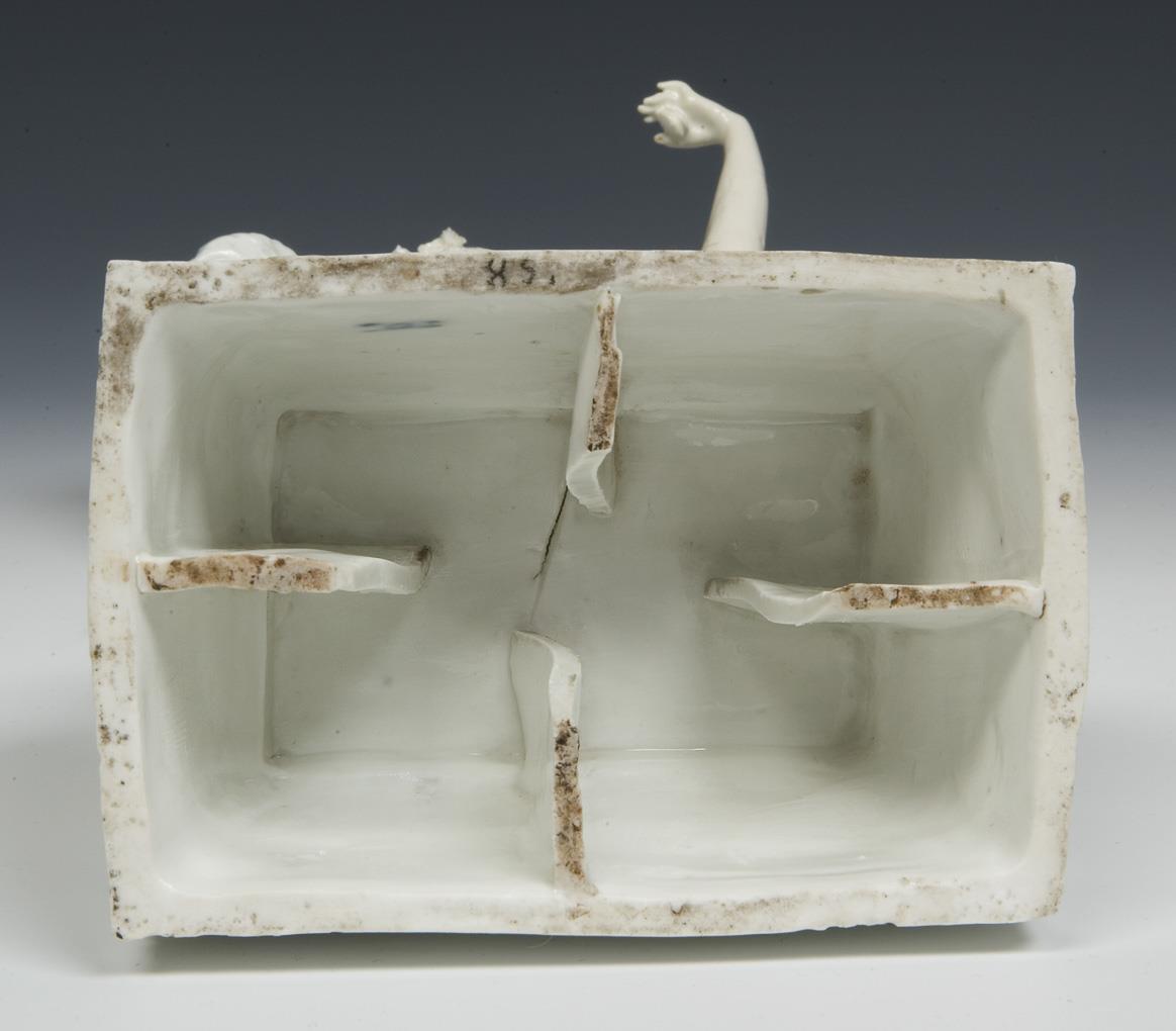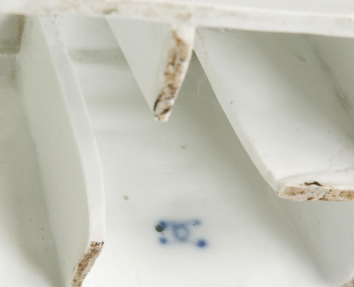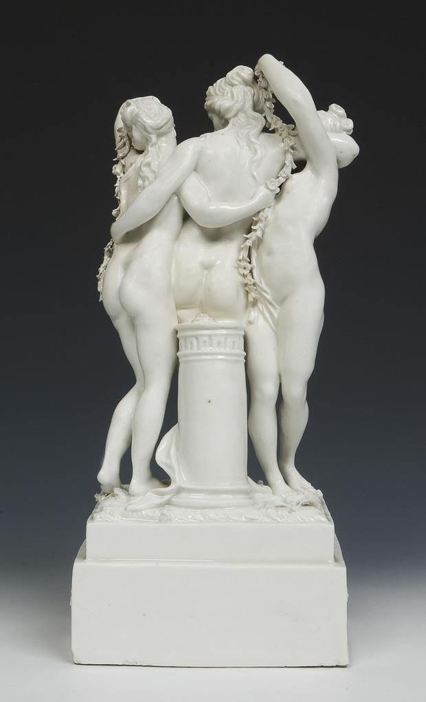 Model by Johann Christian Wilhelm Beyer 1760-1765. white porcelain, double C mark. Girland, two graces in the upper half, column plate restored, one arm glued, garland bumped, stand uneven.