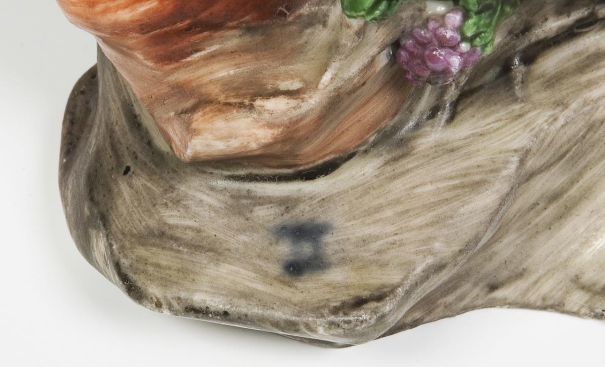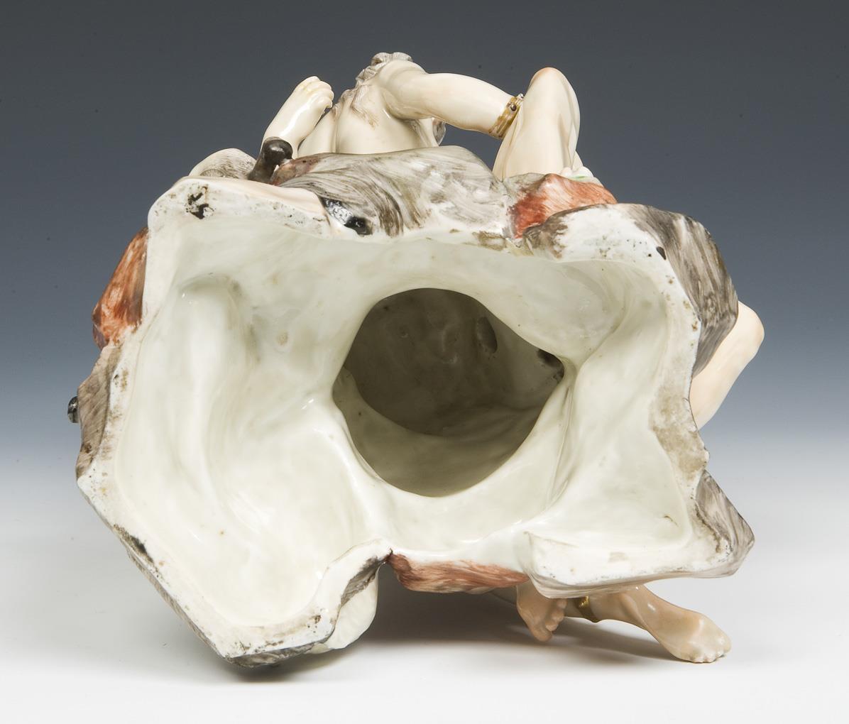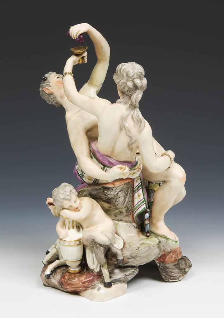 Model by Johann Christian Wilhelm Beyer 1765. colored painted, gold staffiert. Double C mark on the base. Partially restored visibly old: a break on the arm, drinking bowl, toes on one foot, horn, ears of the goat, a lower leg of the satyr boy, staff in satyr hand bumped, a horn missing.