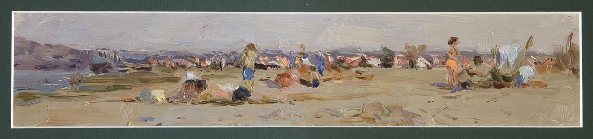 Genre scene in extreme landscape format. Inscribed in Cyrillic on the reverse, Cyrillic stamp. Passepartout, profiled gold frame.