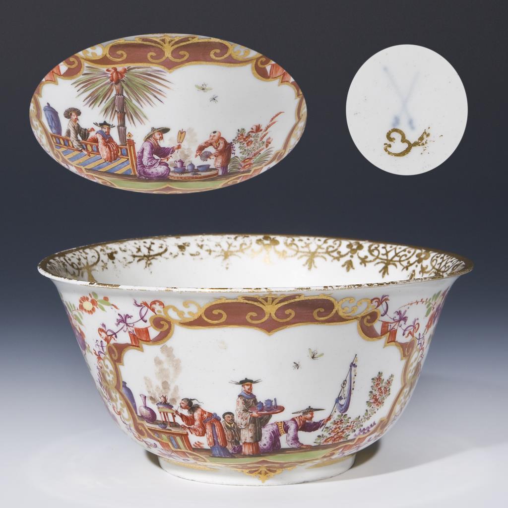 Chinoiserien wurden 1723 von Höroldt (1696-1775) erfunden. Eine heitere, oft groteske Welt, die im chinesischen Gewand den Alltag schildert. In zeichnerischer Meisterschaft sind kunstvolle Miniaturen ausgeführt, von denen keine der anderen gleicht. * Partnerauktion Bergmann.