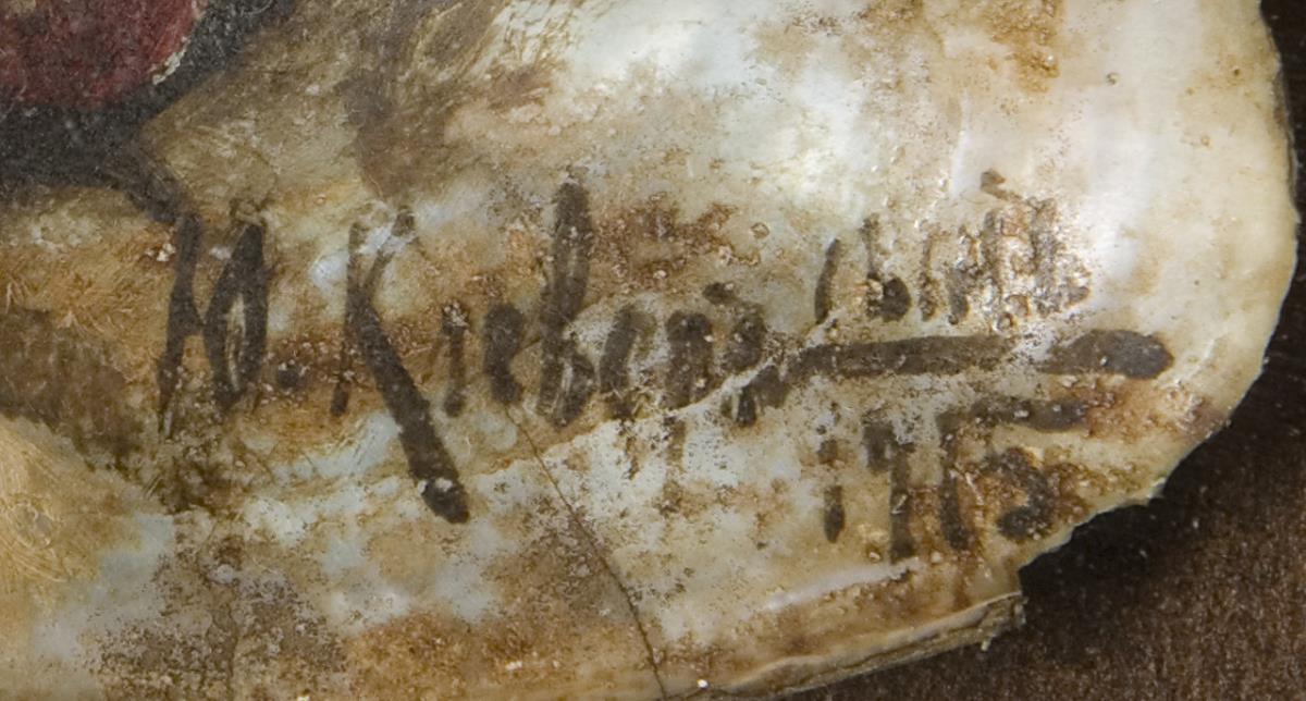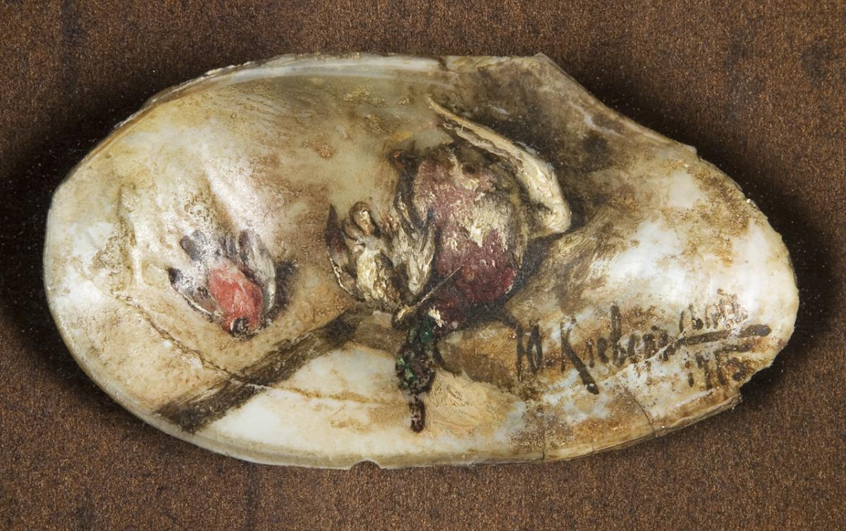 Mixed media on shell. Signed in Cyrillic.