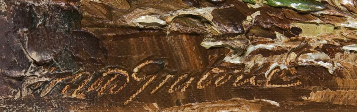 Atmospheric motif in virtuoso spatula technique with bright coloring. On the back old artist label. Profiled frame. Frame partially defective.