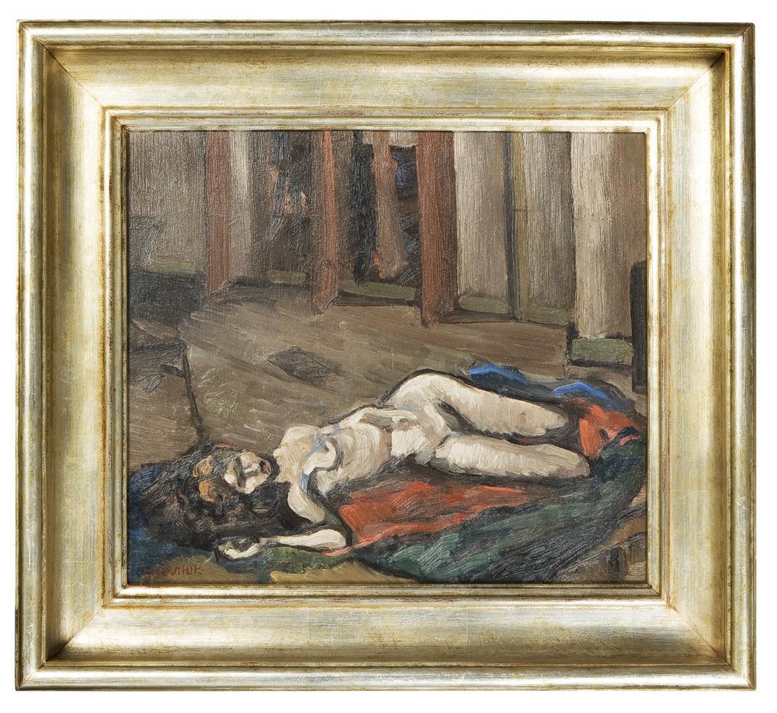 Expressionist painted scene in a largely empty studio interior with a motif reduction and a dissolution of the traditional perspective. Wide profiled silver frame.