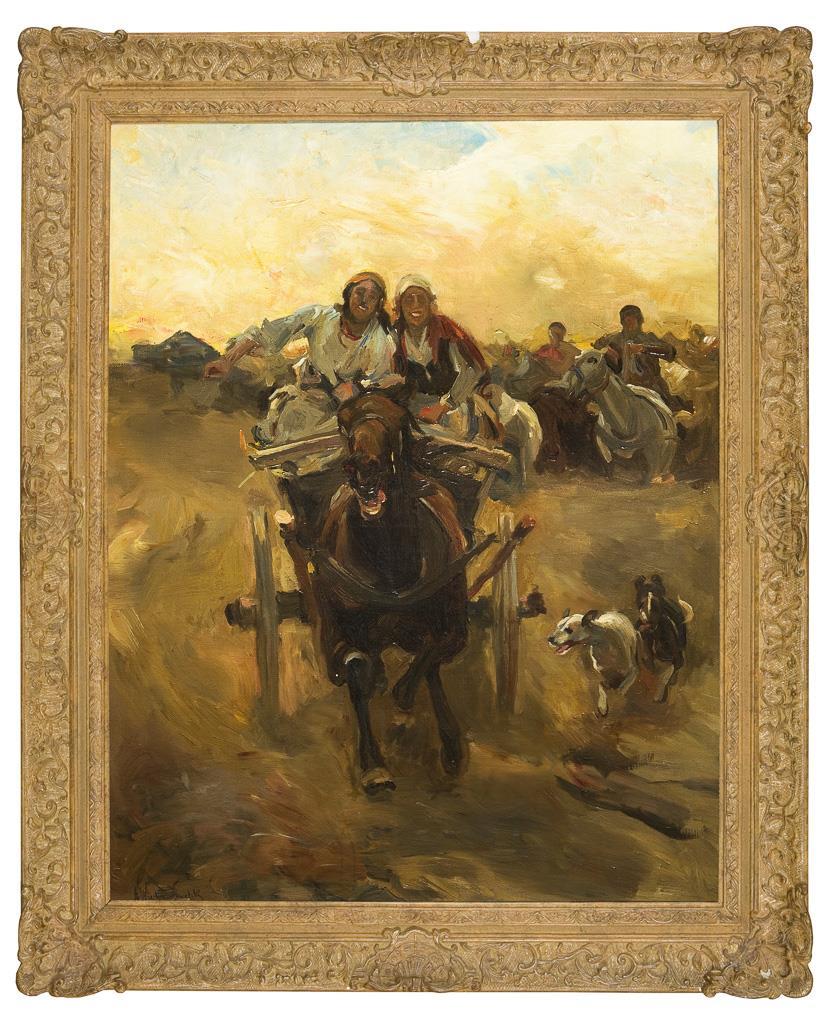 Study for a vivid genre scene with horse and carriage. Original stretcher, heavy stucco frame. Frame partially slightly defective.