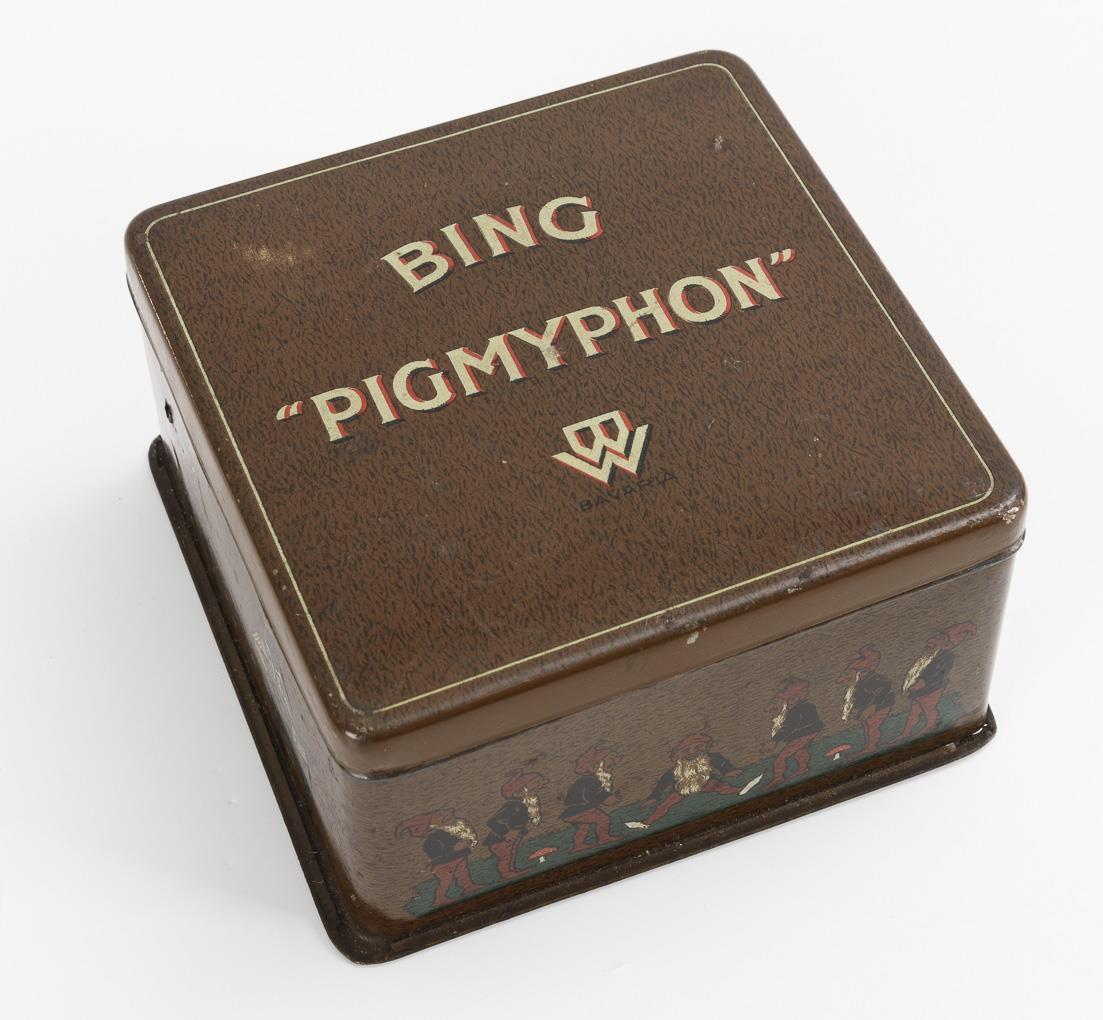 Brown tin box with Christmas record "Pigmynette". Hand crank, pickup and bell loosely enclosed. Small paint defects. Spring mechanism intact: However, playing a record works only with restrictions (revision required).
