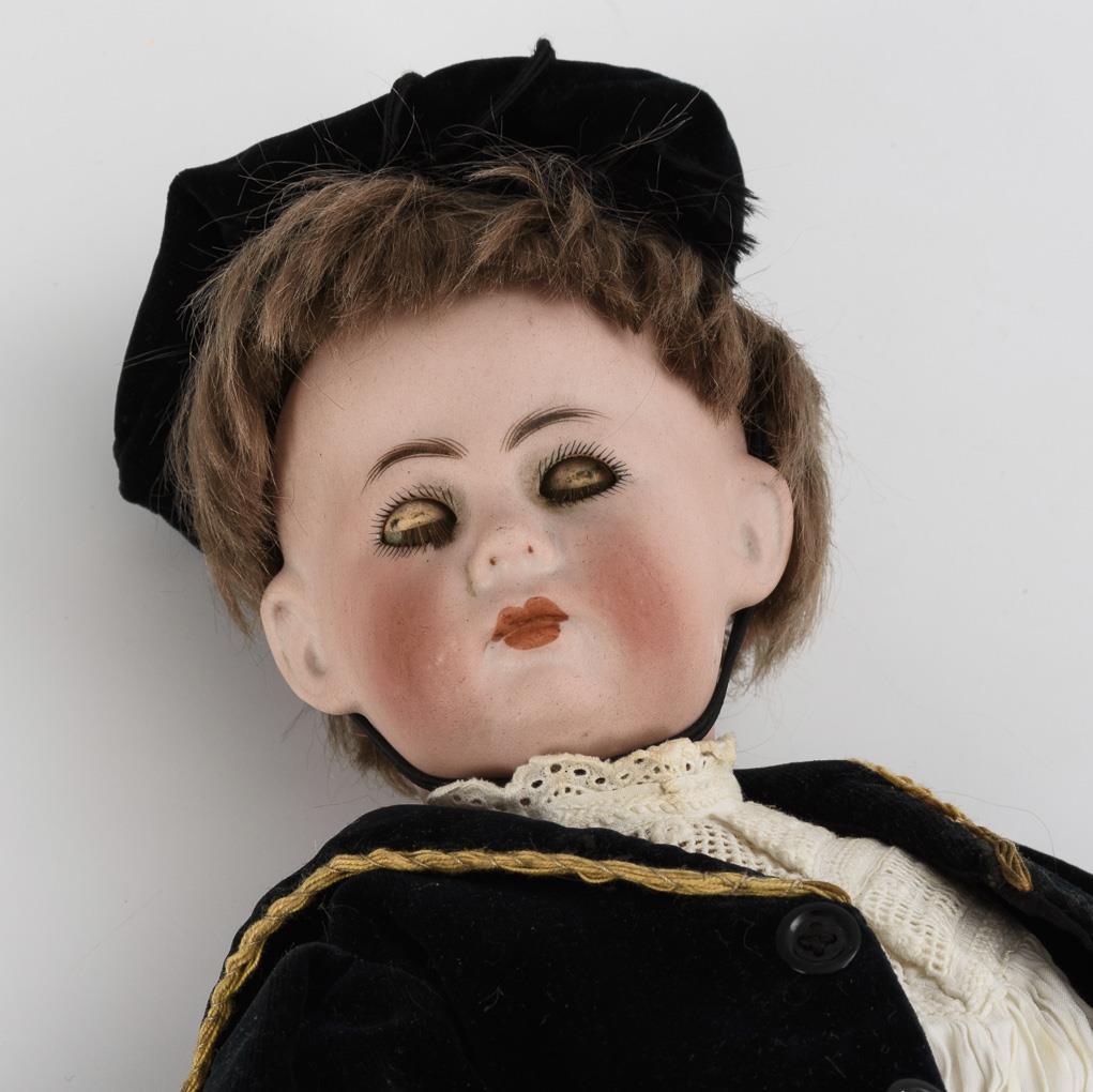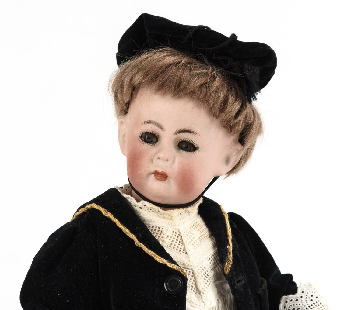 Crank head, blue sleeping eyes, eyelashes, closed mouth, dark blond mohair wig. 17-piece toddler body. Black velvet suit, matching cap, light brown leather shoes. In addition, tin spinning top. Head x-rayed: without defects. Fingers a little rubbed.
