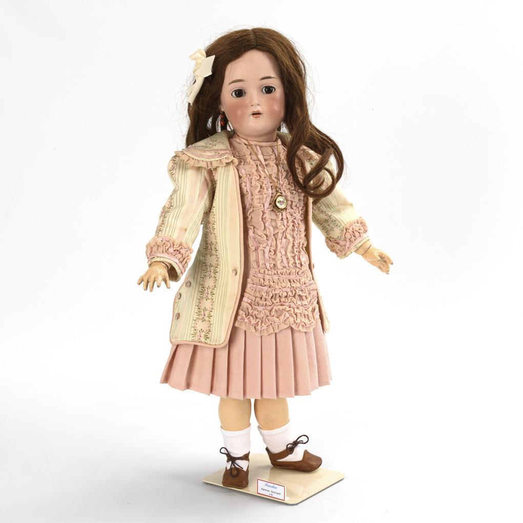 Crank head, brown sleeping eyes, earrings, long brown human hair wig. 15-piece link body. Pink costume, necklace with medallion, brown leather shoes. Head restored.