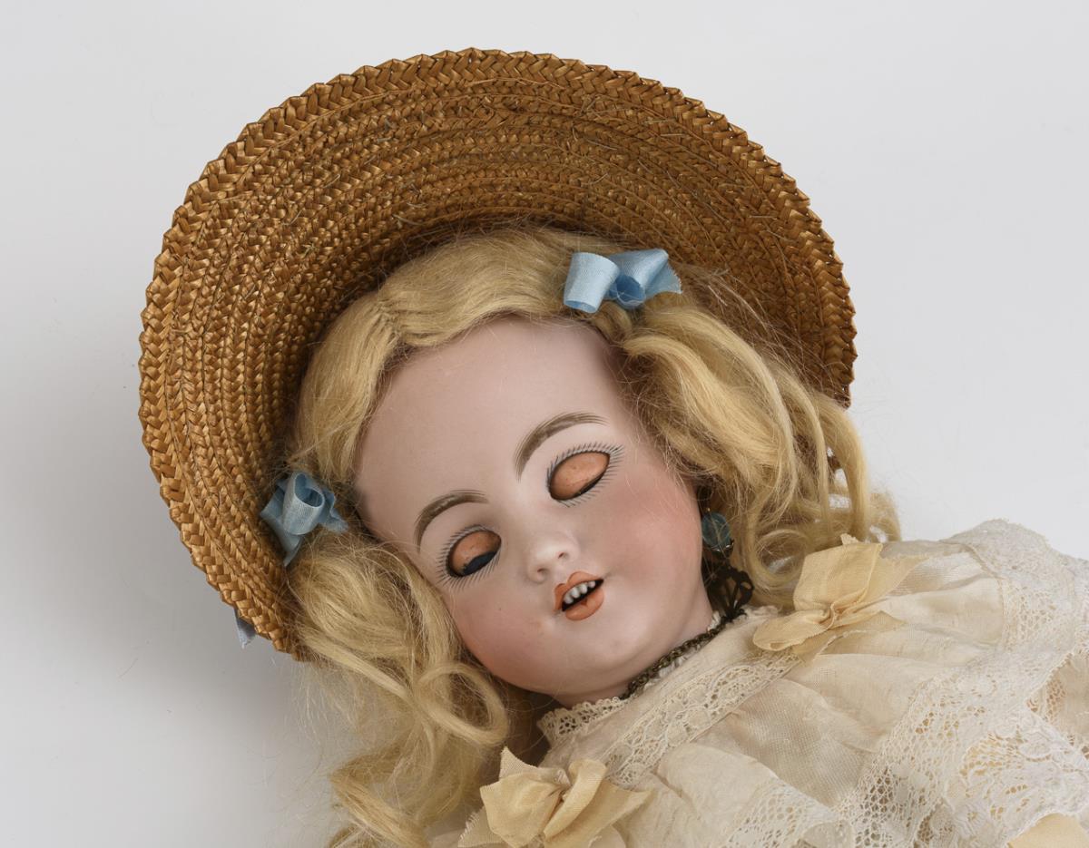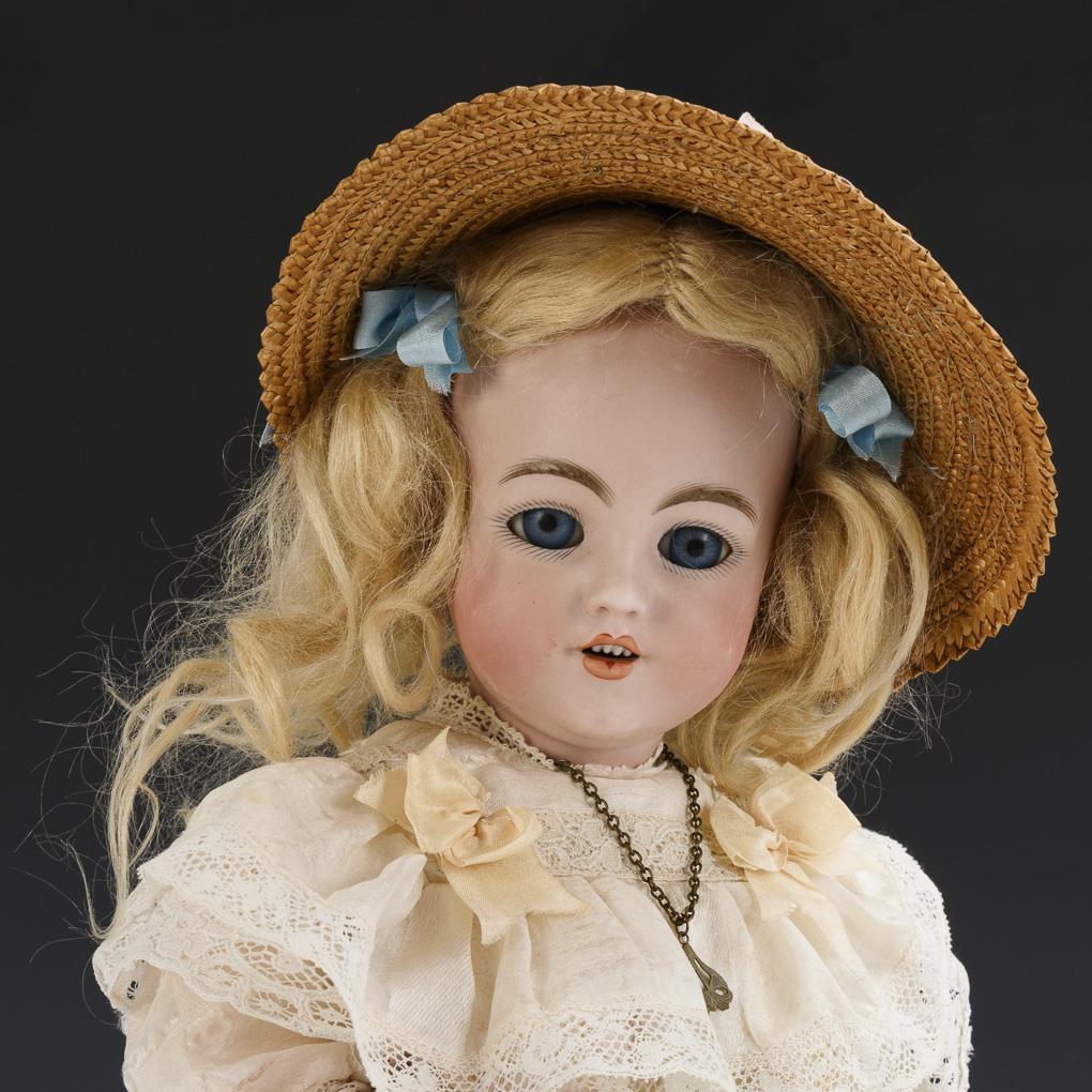 Crank head, blue sleeping eyes, earrings, blond mohair wig. 11-piece articulated body. White silk dress, straw hat, white leather shoes, flower basket. Head not x-rayed: Burn crack and defect on the right ear. Body probably partially painted over.