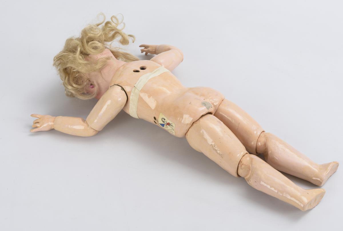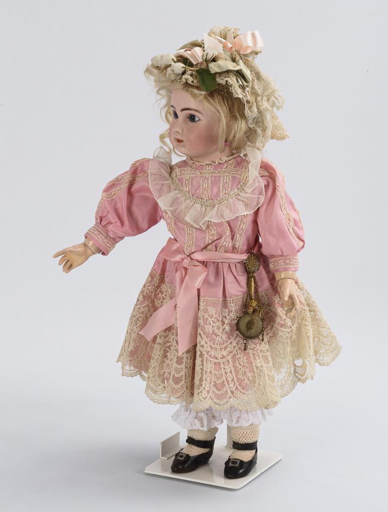Crank head, fixed blue eyes, closed mouth, blond mohair perücke. 11-piece articulated body with defective train voice (teeth missing). Pink dress with lace, lace hood, old black leather shoes. Head not x-rayed: no defects visible, only 2 minimal burn cracks and 2 tiny chips on the ears. Paint defect on the butt, fingers with small repair spots.