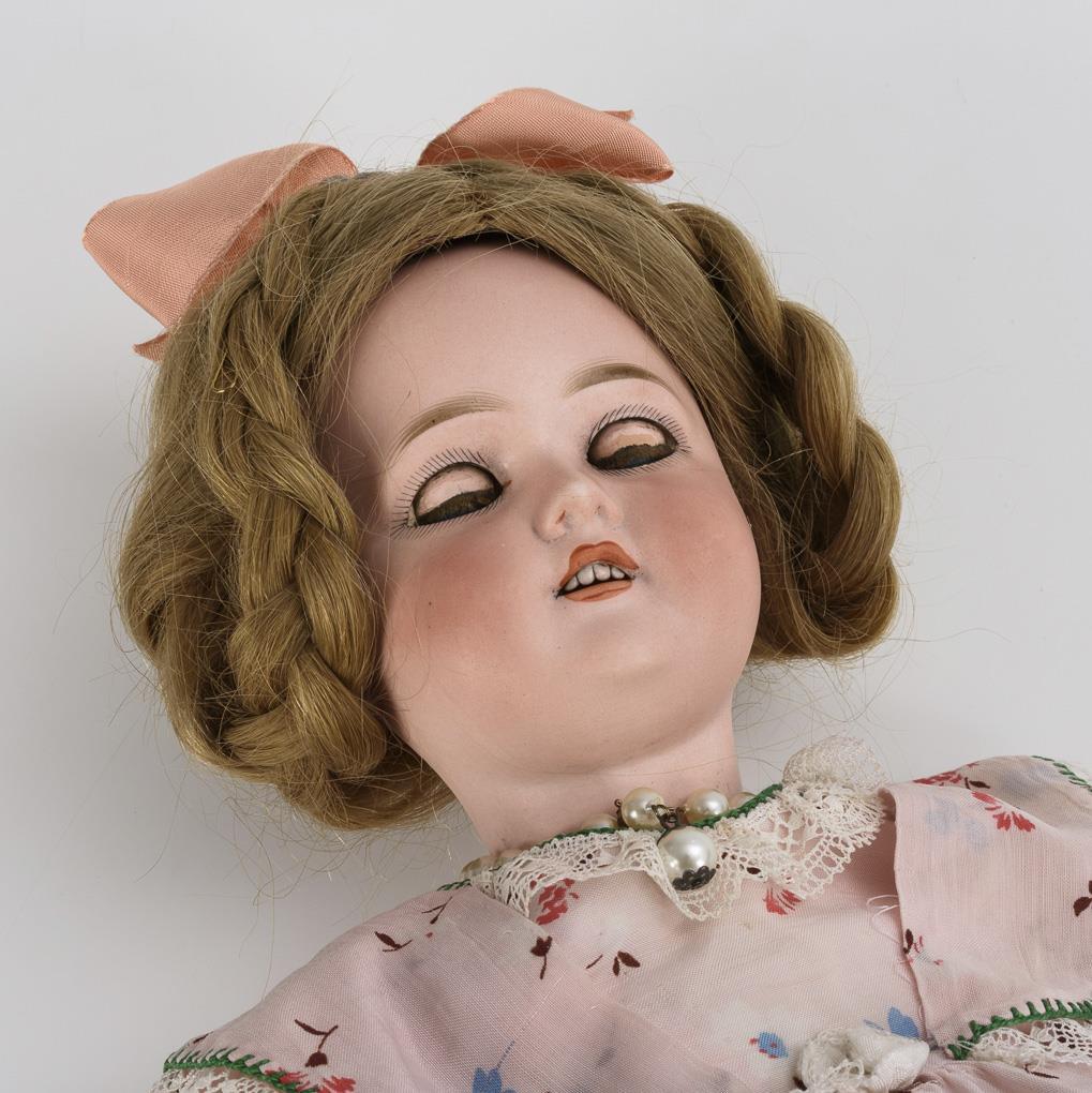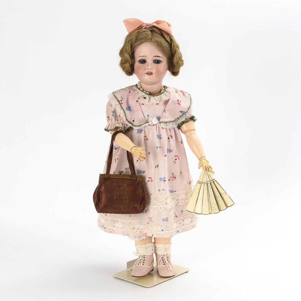 Crank head, blue sleeping eyes, eyelash remnants, medium blond human hair wig with braided hair wreath. New, 15-piece articulated body. Pink dress with floral pattern and lace trim, pink leather shoes,
