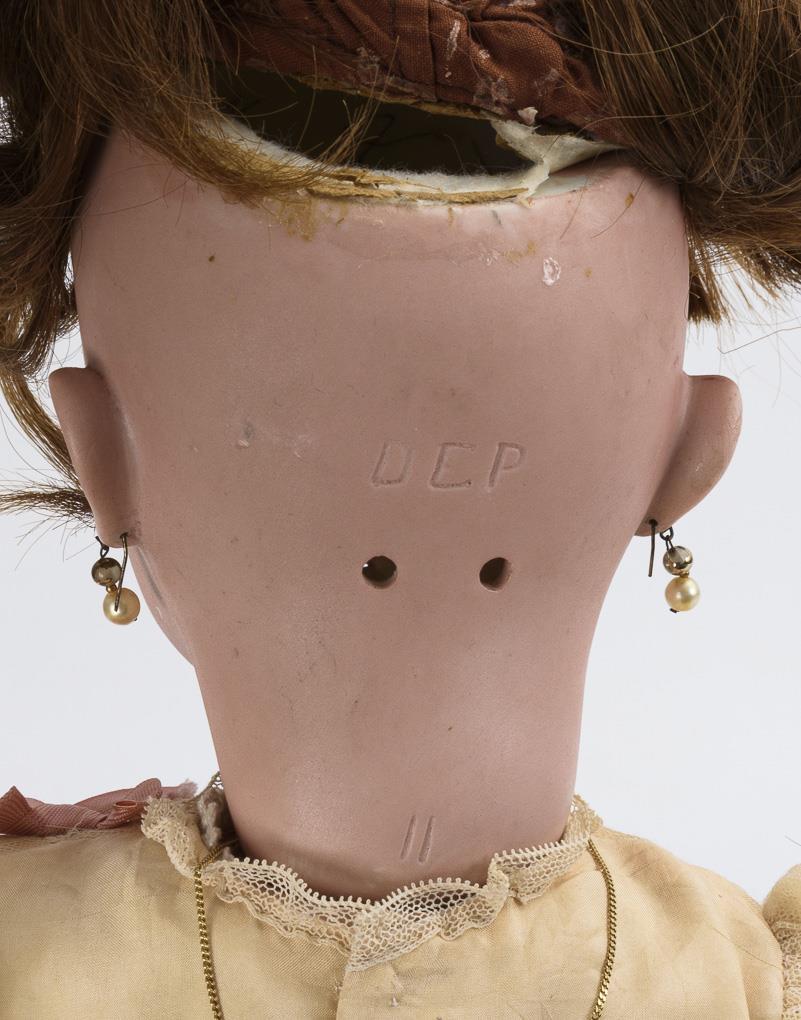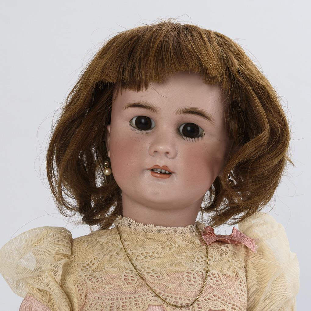 Crank head, fixed brown eyes, earrings, brown human hair wig. 15-piece limb body. Creamy white silk dress with lace and pink trim, white leather shoes, pink parasol. Head x-rayed: only minimal burn crack behind the ears and 1 tiny chip on the upper left eyelid. Hands with small repair spots / overpaintings.