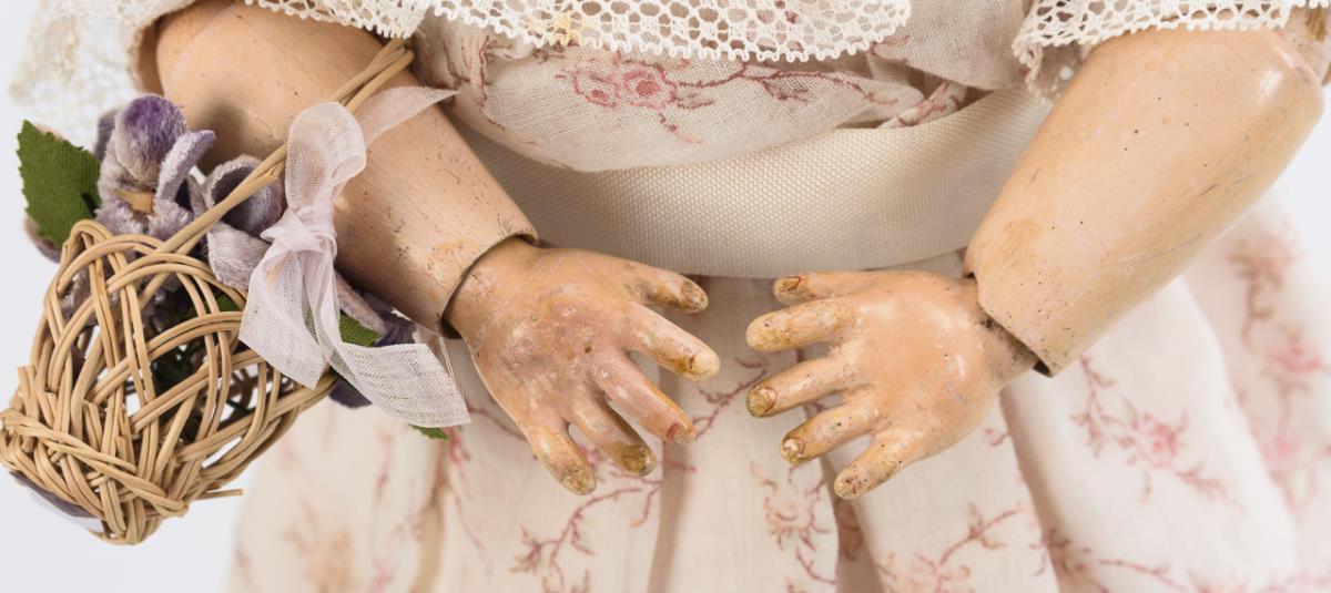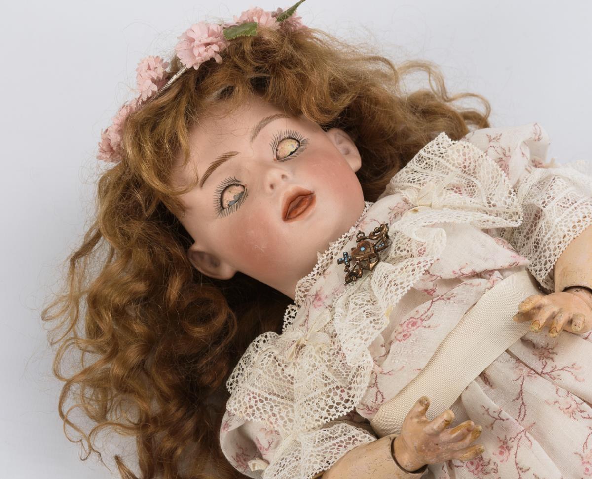 Crank head, blue sleeping eyes, modeled tongue, complemented long mohair wig with curls. 17-piece articulated body. White dress with rose pattern, pink hair wreath, old brown shoes, flower basket. Head x-rayed: without defects. Middle finger glued left.