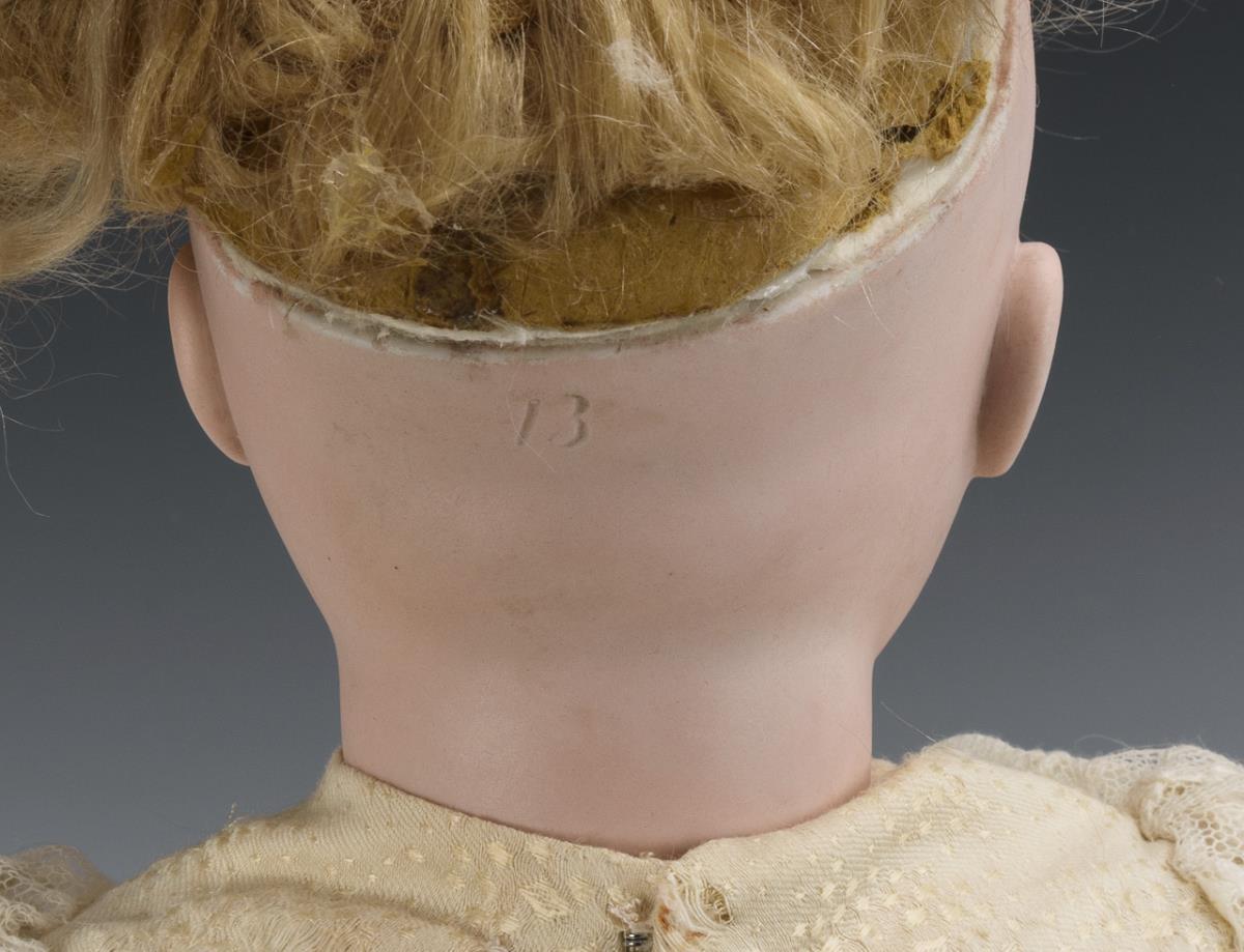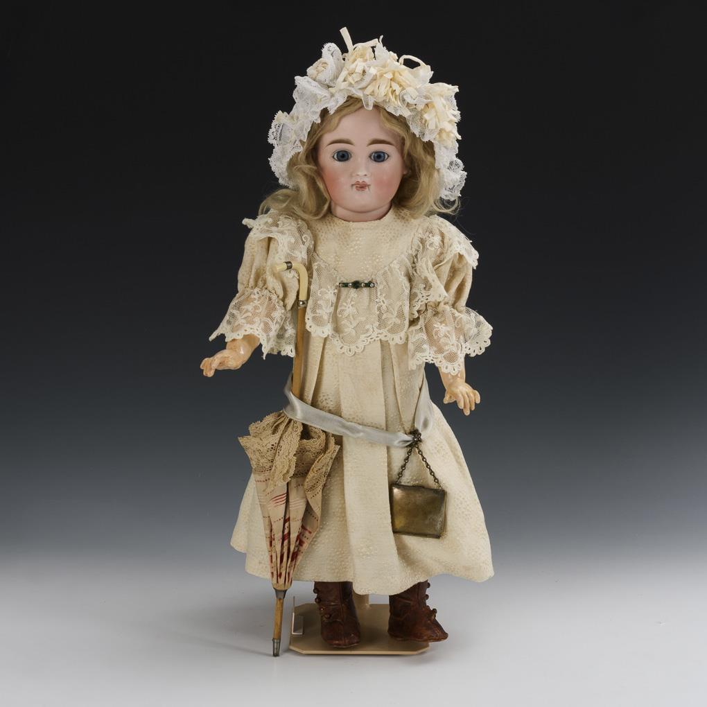 Crank head, blue sleeping eyes, closed mouth, blond mohair wig. 9-piece articulated body. White dress, matching cloth hat, old brown leather boots, plus umbrella and brass bag. Head x-rayed: without defects. Forearms somewhat painted over.