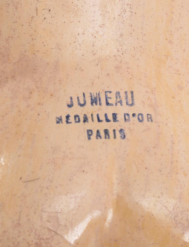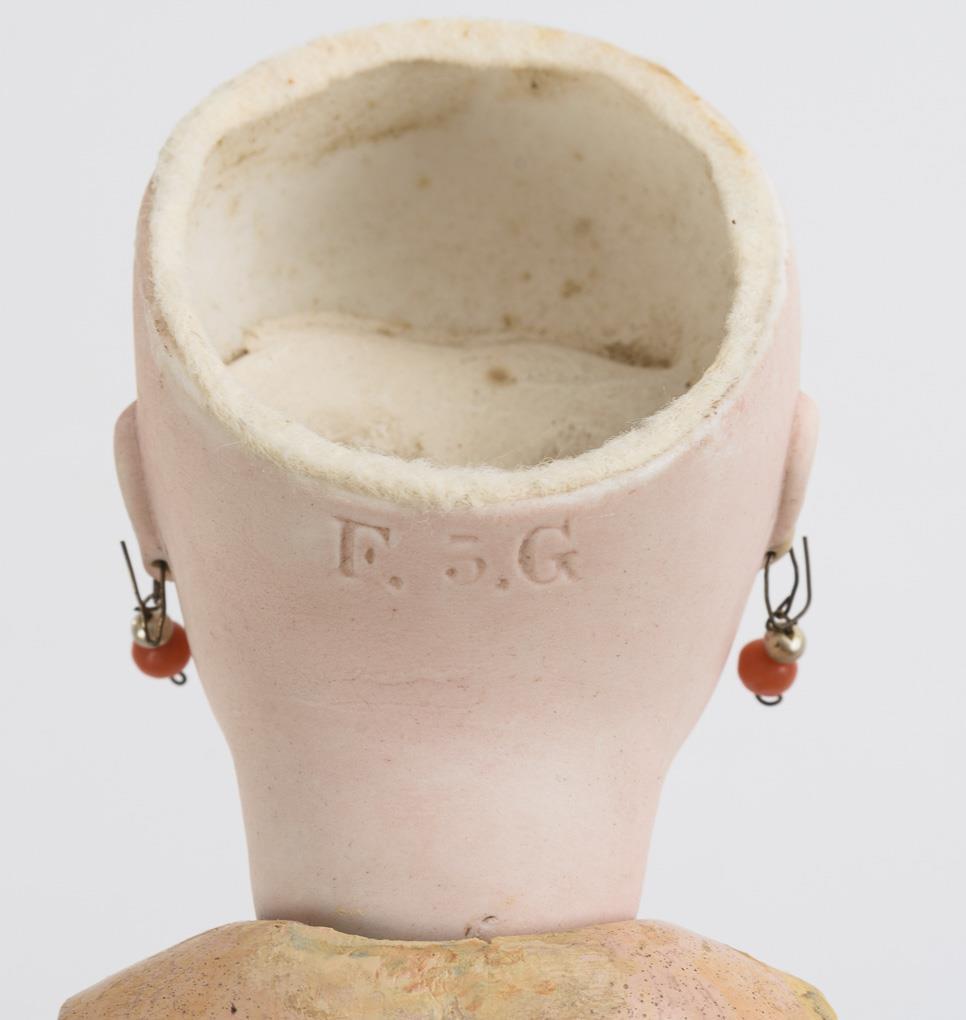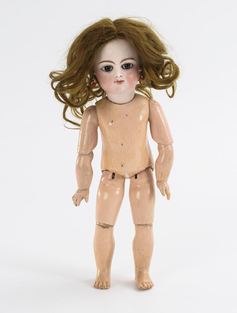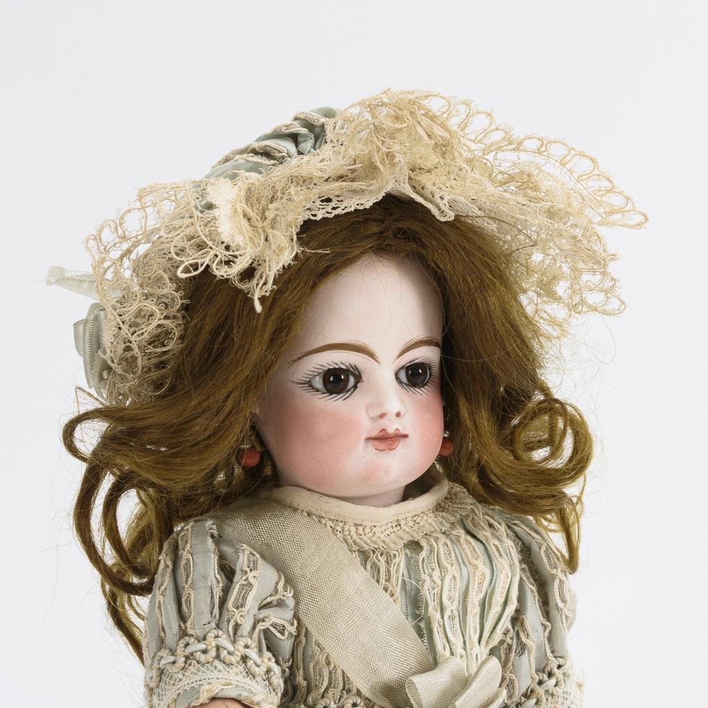 Decorative porcelain head girl with crank head, fixed brown glass eyes, earrings, closed mouth and brown mohair wig. 9-piece jointed body. Pale blue dress with lace, matching hat, black leather shoes, egg-shaped brass bag. Earlobe right minimally restored, earlobe left with minimal chip. Body with minimal paint defects, hands with repair marks.