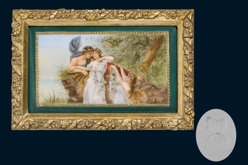 Farbig bemalt. Vergoldeter Stuckrahmen.9 x 14,5 cm, Rahmen: 11 x 17 cm.