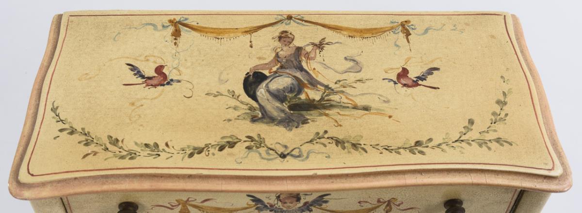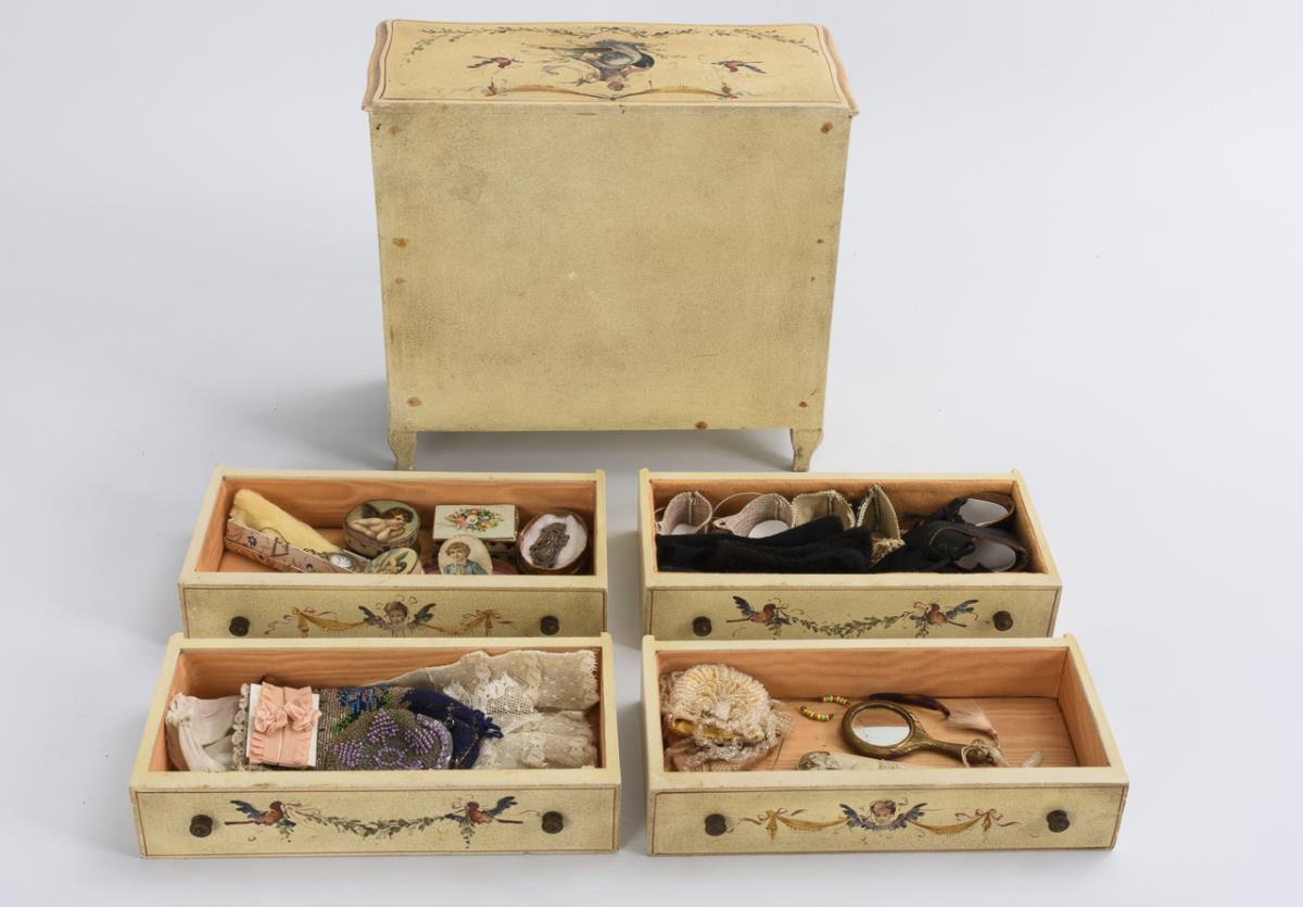 4-bowl doll commode with garland decoration. 24,5 x 27 x 12,5 cm. Well filled with accessories such as boxes, mirrors, little bags, shoes etc. / Gold bronzed chair with burgundy velvet upholstery. H 30 cm. / In addition, brown leather booties, baskets, gloves, straw hat etc.
