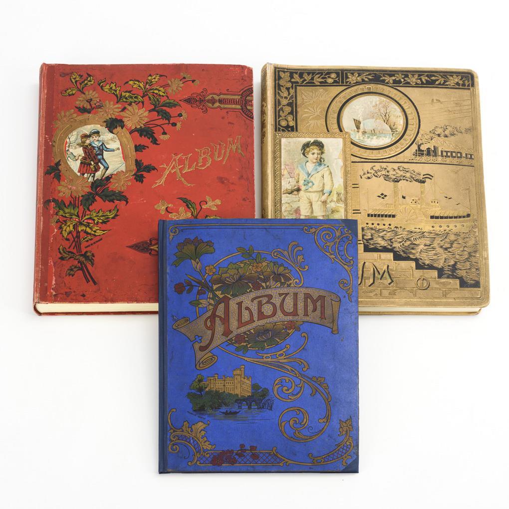 According to topics densely pasted with luxury papers: eg sacred (Madonnas, saints, Christmas, devotional images, crosses, etc.), flowers, animals, ladies, fashion, gallant scenes, children, circus, firefighters, ethnics, caricatures, etc., including some very large. Albums with some signs of age / use.