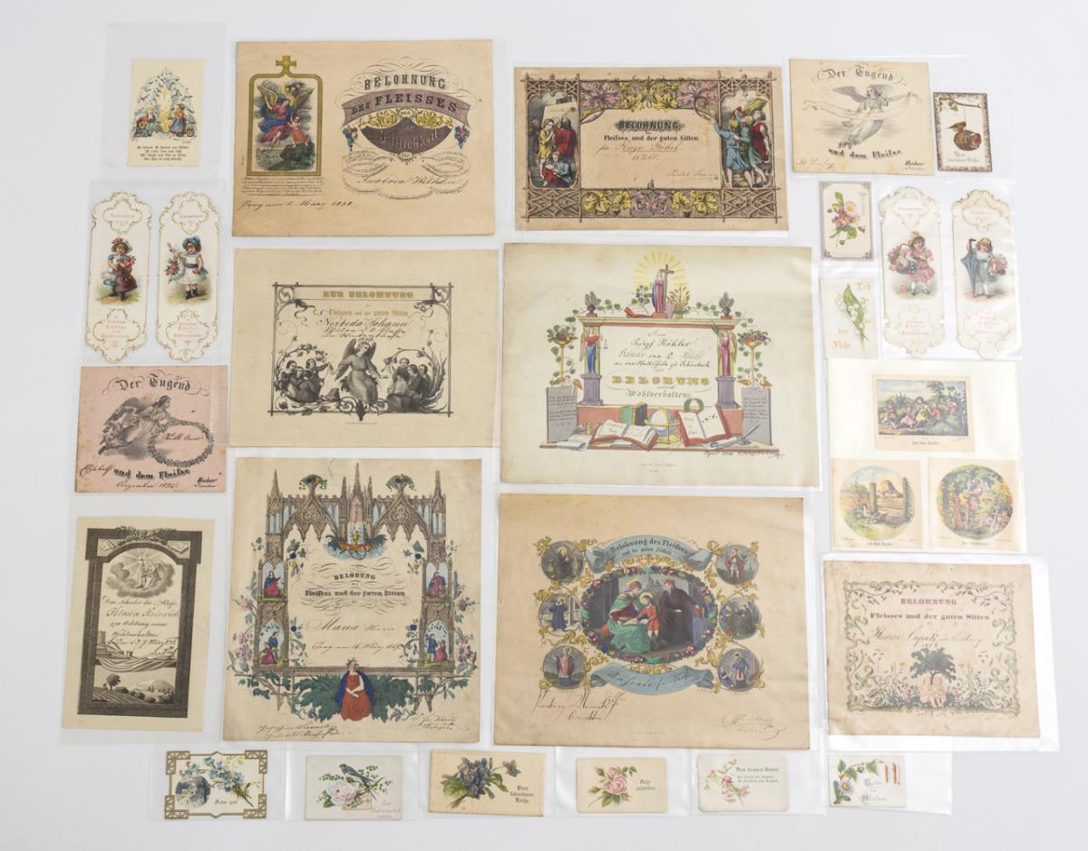 Approx. 27 Fleißbilletts, including 7 large "Reward of diligence and good manners" (1838-68) and 2 other early ones with handwritten entries. Unmarked praise slips with glossy images and sayings; some worked as bookmarks. Partly browned / foxing.
