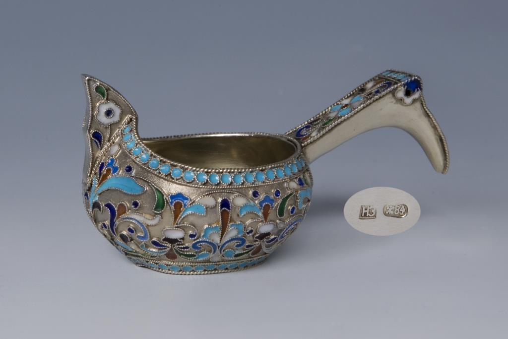 Silber, 84 Zolotnik, vergoldet, Cloisonné-Email. Traditionelle Form. Punzen: Kyrillsche Meistermarke, Stadtmarke mit Feingehalt. Eine kleine Delle im Boden.