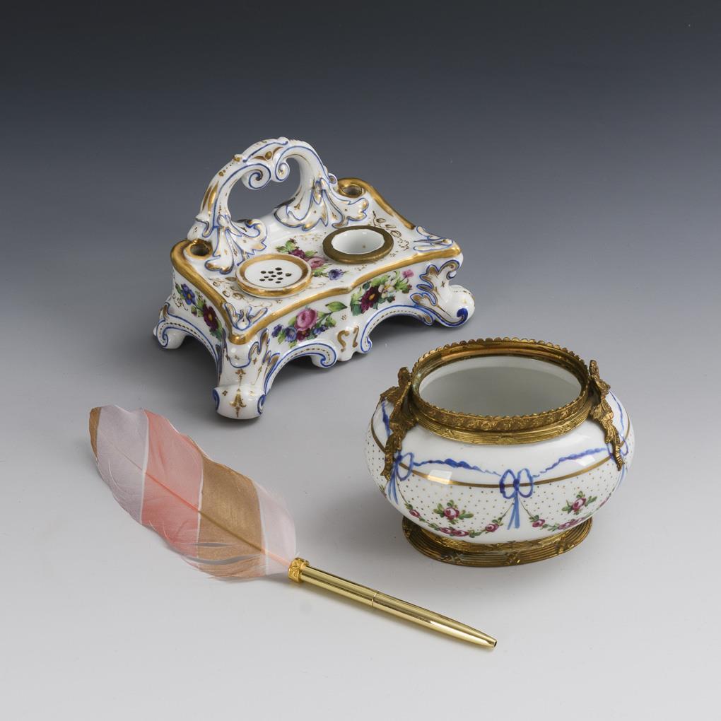 Small writing utensil with floral painting, scattering flask, inkwell and a modern ballpoint pen with nib. / Oval, pressed bulged bowl with brass mounted stand and rim and floral painting. Rim of the inkwell gold retouched and with 1 bump.