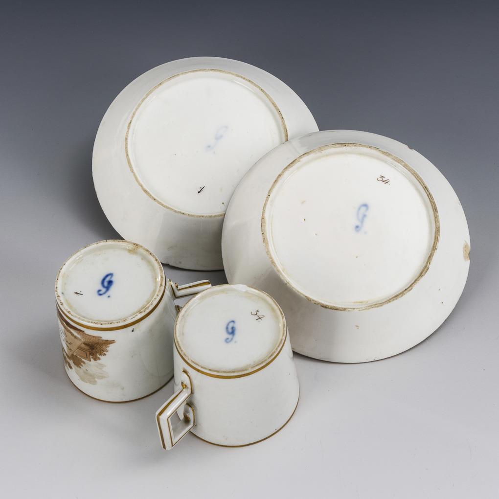 Sepia painting, gold staffage. 2 cups (h 6 cm), 2 saucers (Ø 12,5 cm).