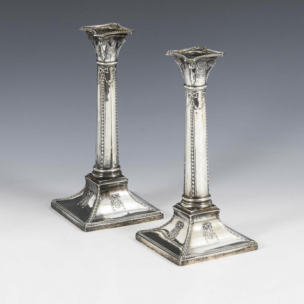 Elegant candlesticks in column form. At the foot military dedication engraving "1st Heavy Brigade R.C.A.". Signs of use, few small dents.