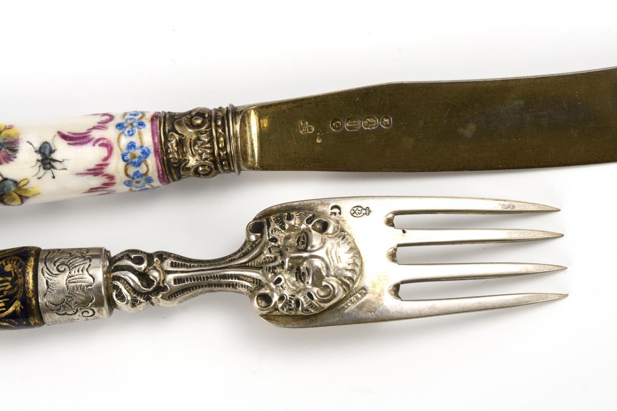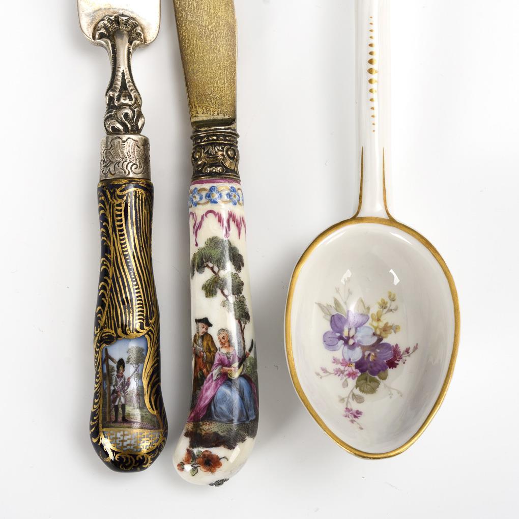 1x knife with Victorian silver blade (hallmarked) and porcelain handle with Watteau painting (L 23 cm). / 1x fork with silver prongs (punched) and porcelain handle with cobalt background, rich gold staffage and soldier painting. / 1x serving spoon, KPM Berlin, unmarked: with flowers and butterflies in the style of soft painting (L 19.5 cm). Knife handle restored.