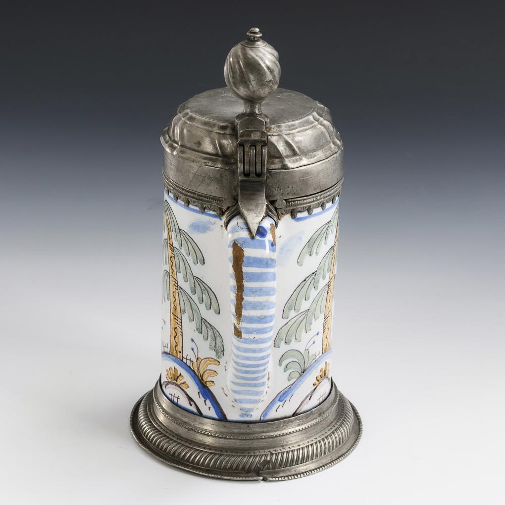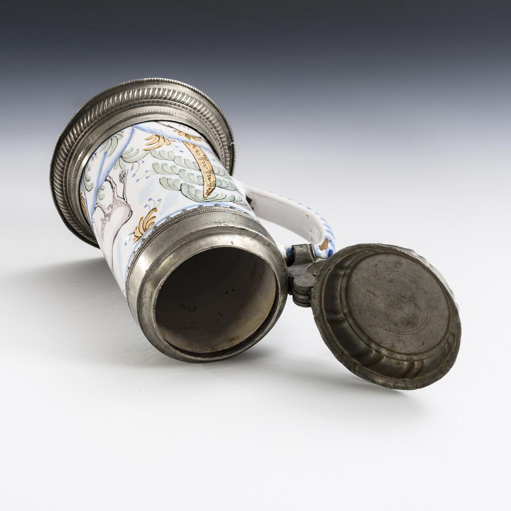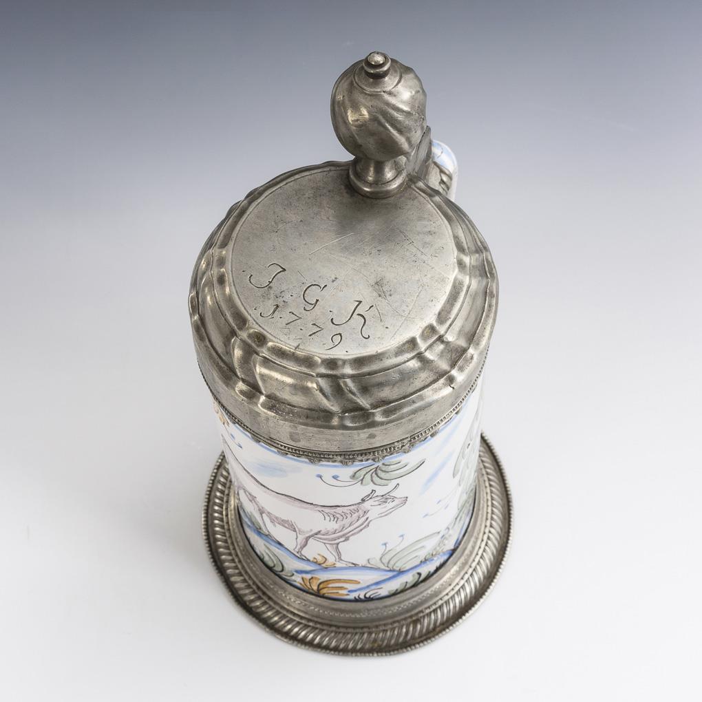 Cylindrical body with ribbon handle, on the outside an ox in a landscape. Godroned pewter lid with ball pusher, engraved "JGK 1779", wide, profiled pewter stand. Glaze defects on the handle, traces of use on the pewter.