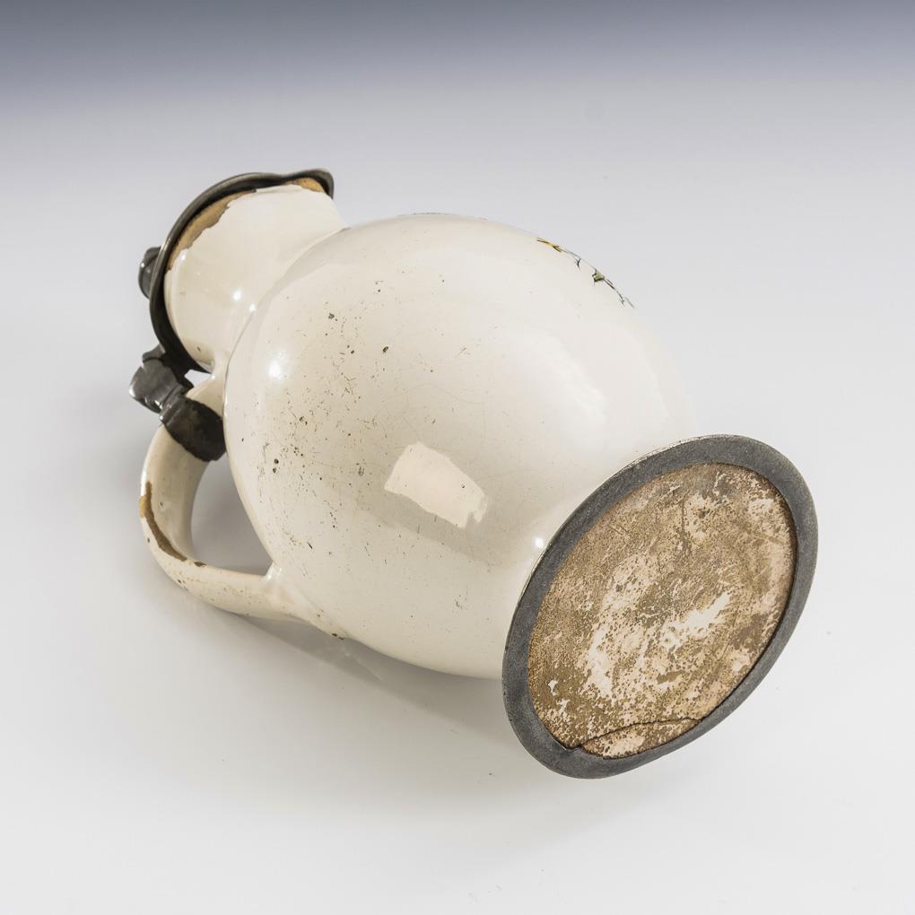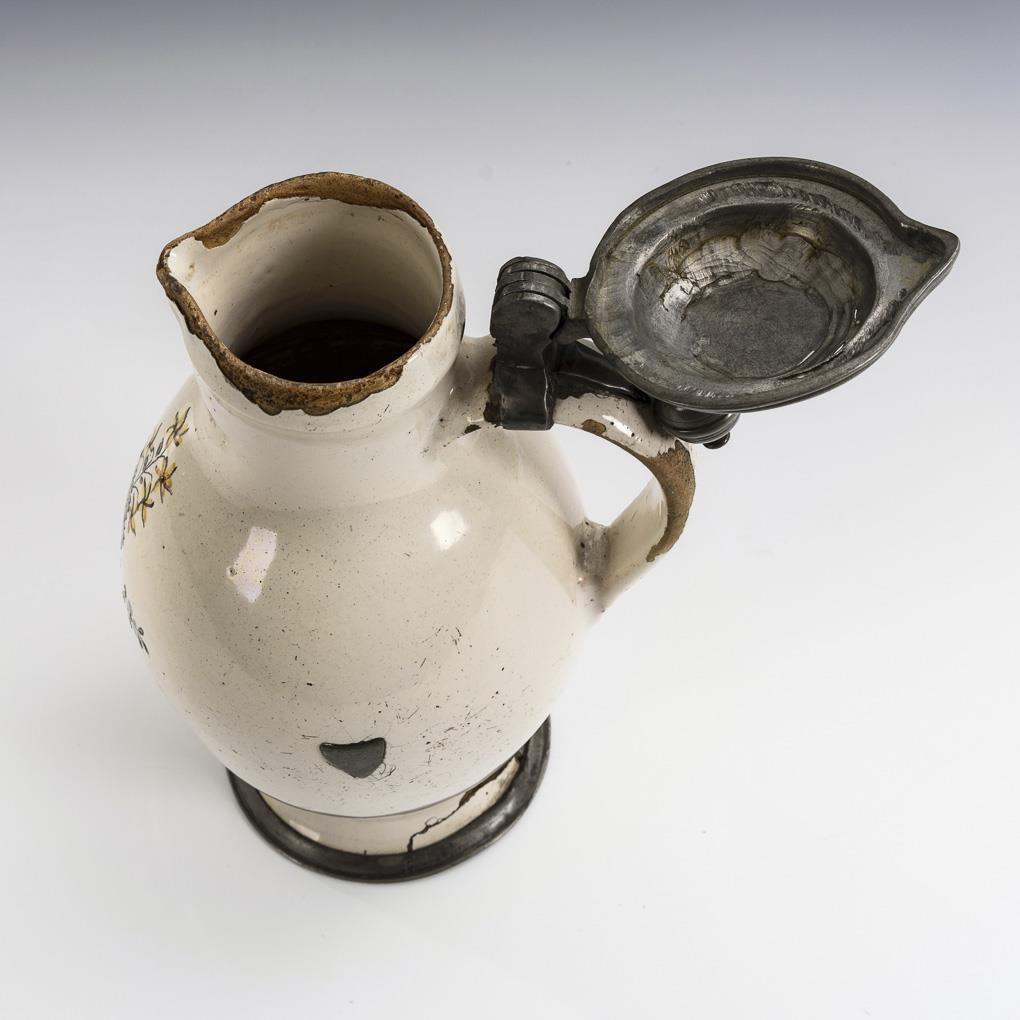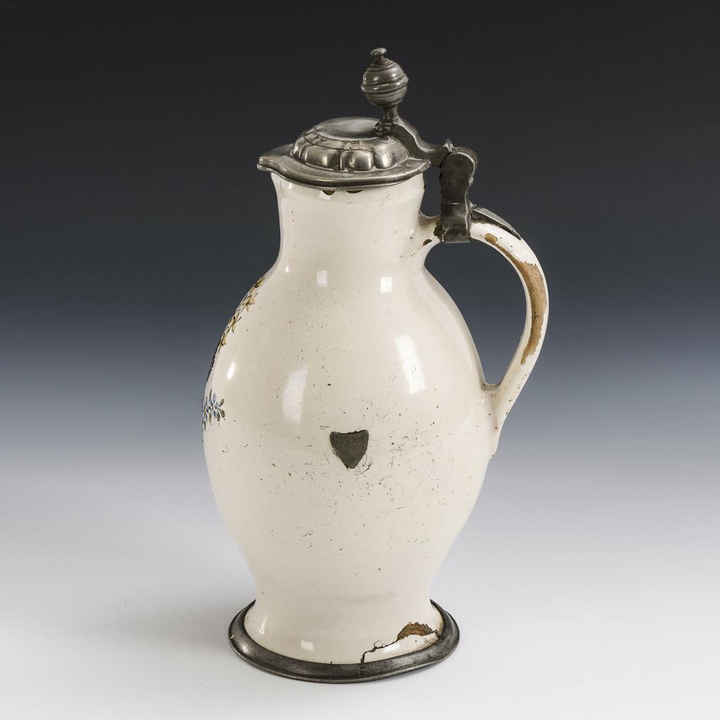 Ovoid body with ribbon handle, floral branches on the front. Profiled pewter lid with ball pusher, pewter stand ring. With defects.
