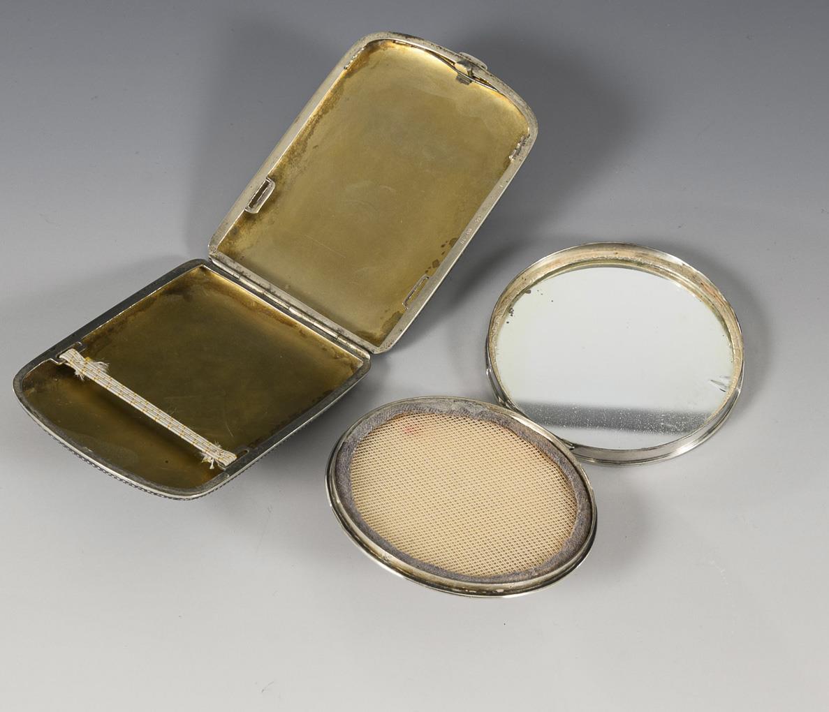 Silver cigarette case and silver-plated compact.
